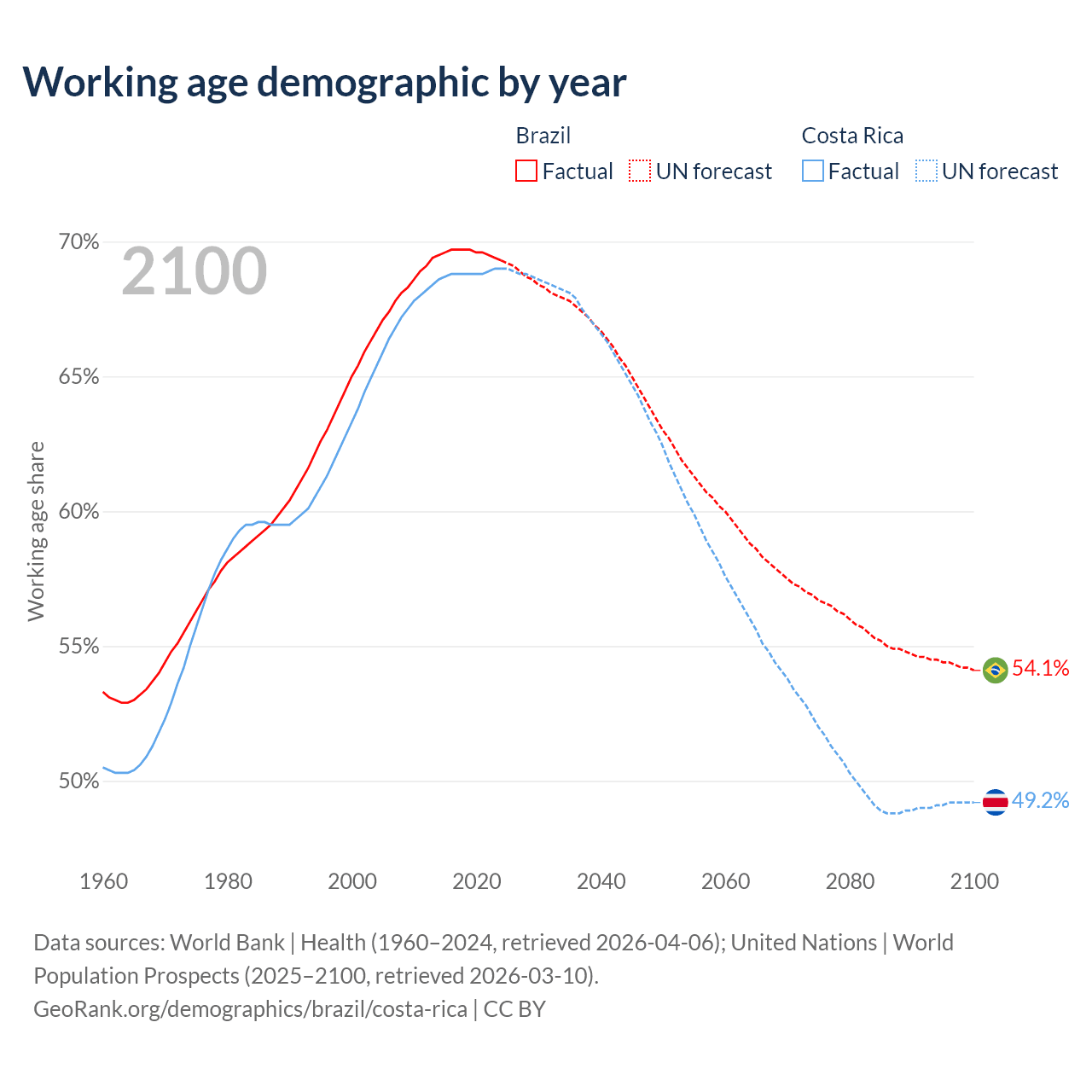 - Brazil has 148M working age adults (aged 15-64) vs 3.57M in Costa Rica.