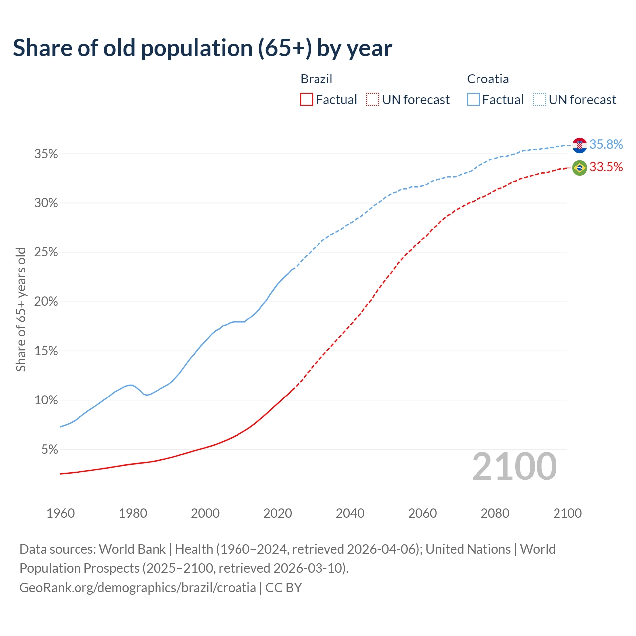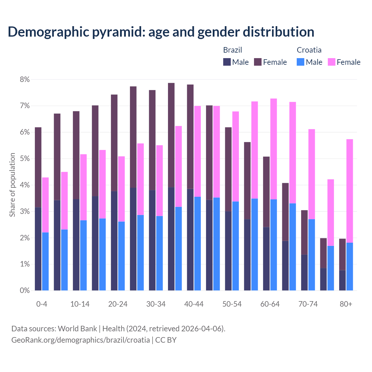 The share of older people aged 65 and over is 11% in Brazil and 23.2% in Croatia. Life expectancy in Brazil compared to Croatia .