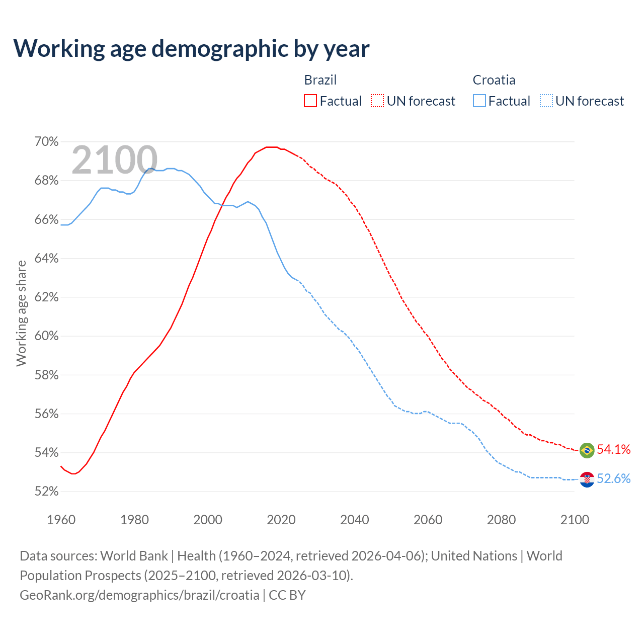 - Brazil is ranked 73/196 by median age (oldest to youngest) vs 11/196 for Croatia.