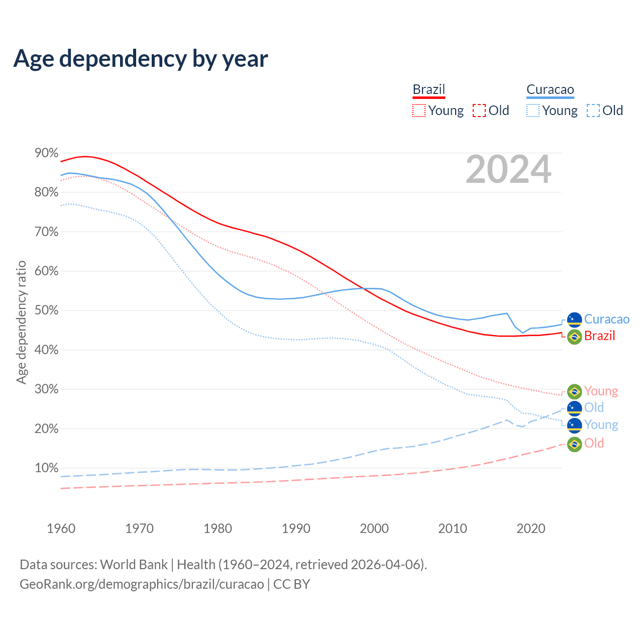 The share of older people aged 65 and over is 11% in Brazil and 16.8% in Curacao. Life expectancy in Brazil compared to Curacao .