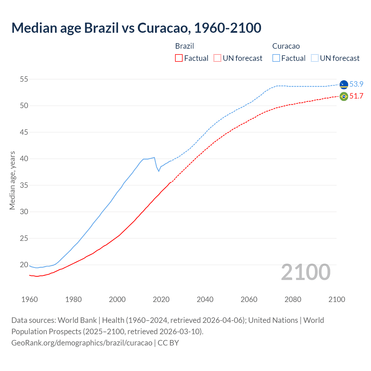 - The median age in Brazil is 35.4 years compared to 39.5 years in Curacao.