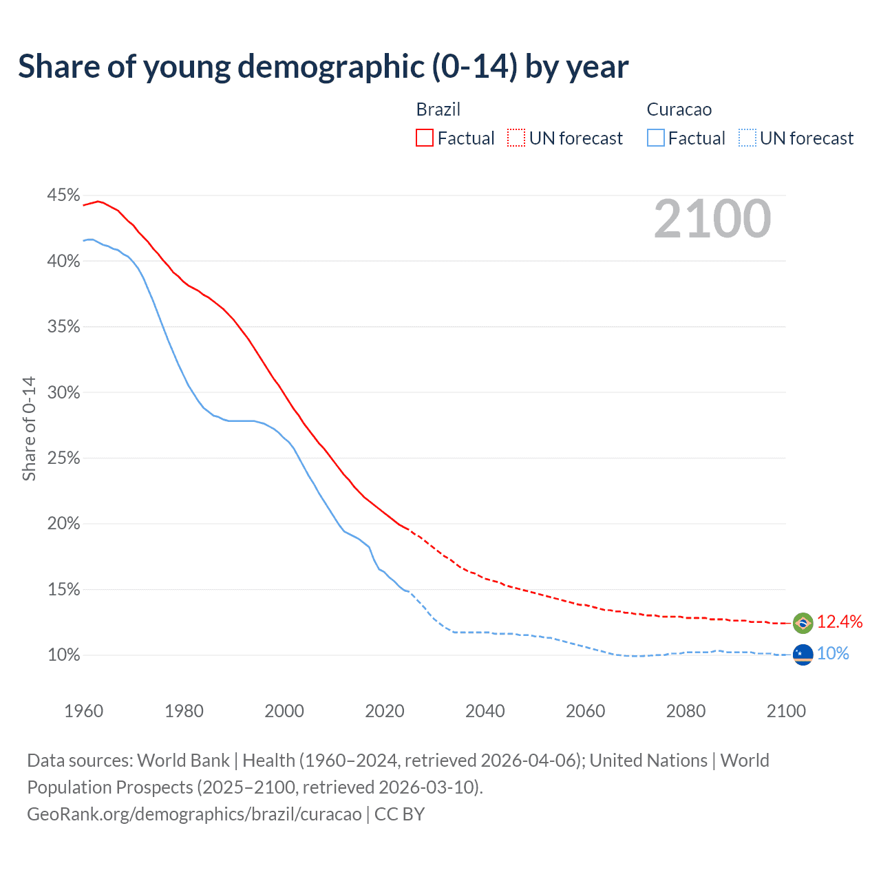 - The share of young demographic (0-15 years old) in Brazil is 19.7% vs 14.9% in Curacao.
