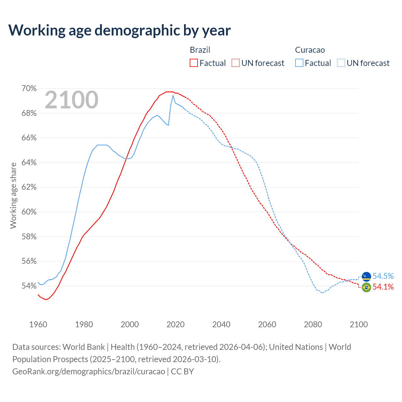 - Brazil has 148M working age adults (aged 15-64) vs 107K in Curacao.