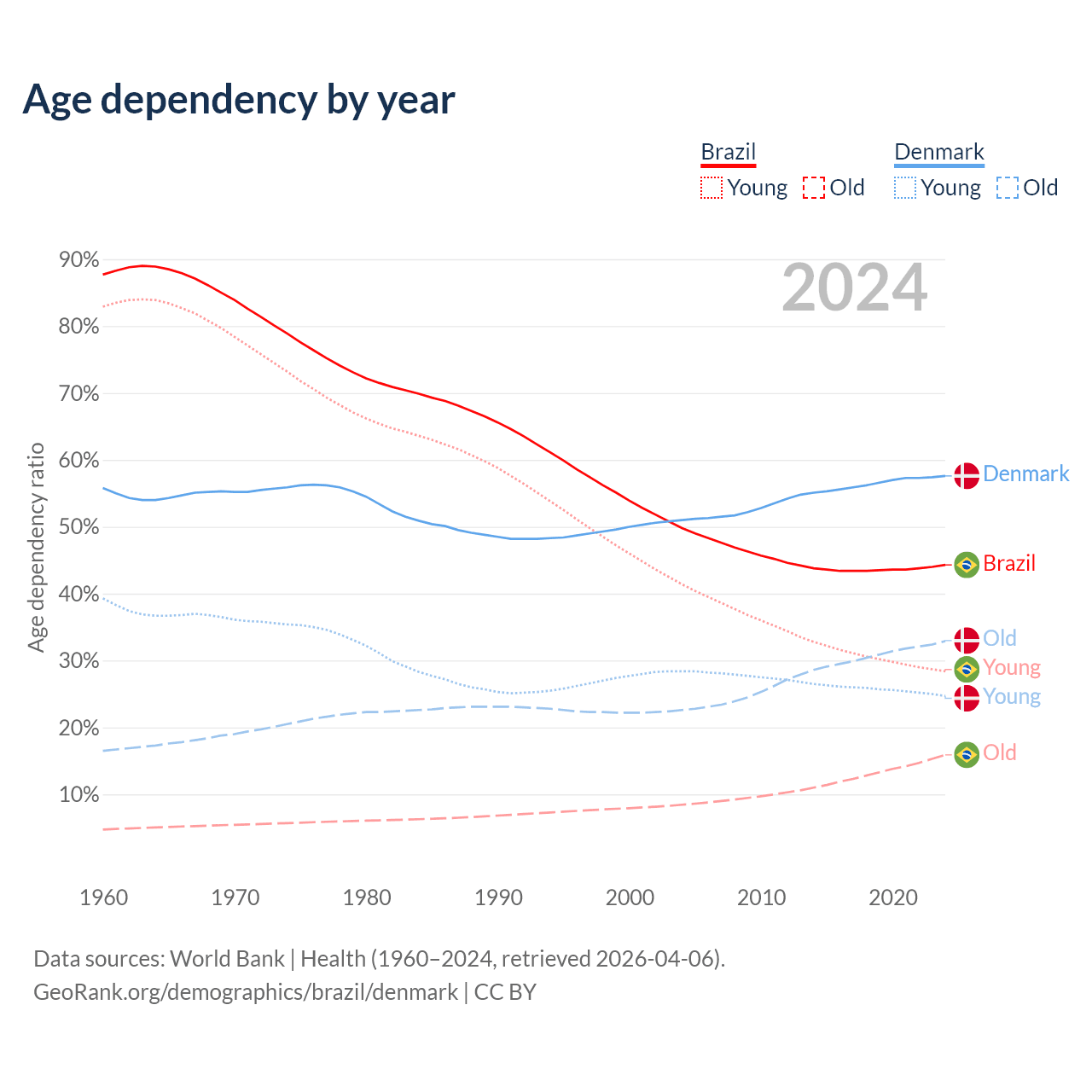 The share of older people aged 65 and over is 11% in Brazil and 20.9% in Denmark. Life expectancy in Brazil compared to Denmark .