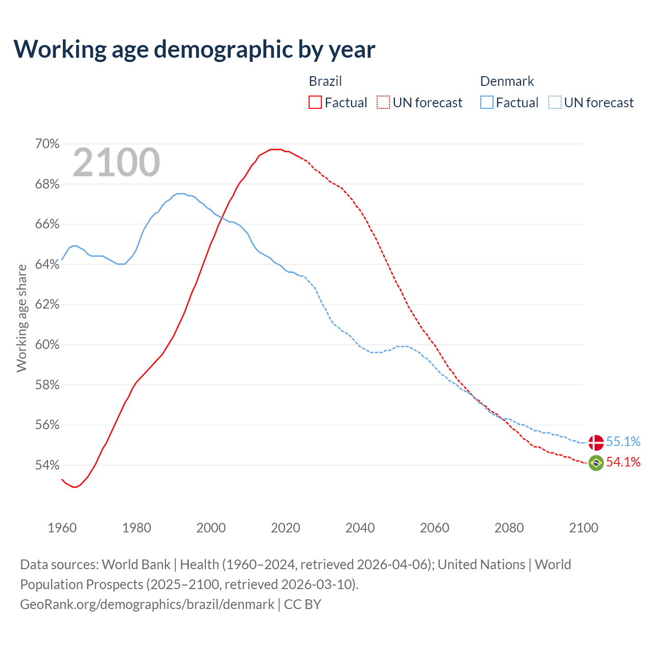- Brazil has 148M working age adults (aged 15-64) vs 3.83M in Denmark.