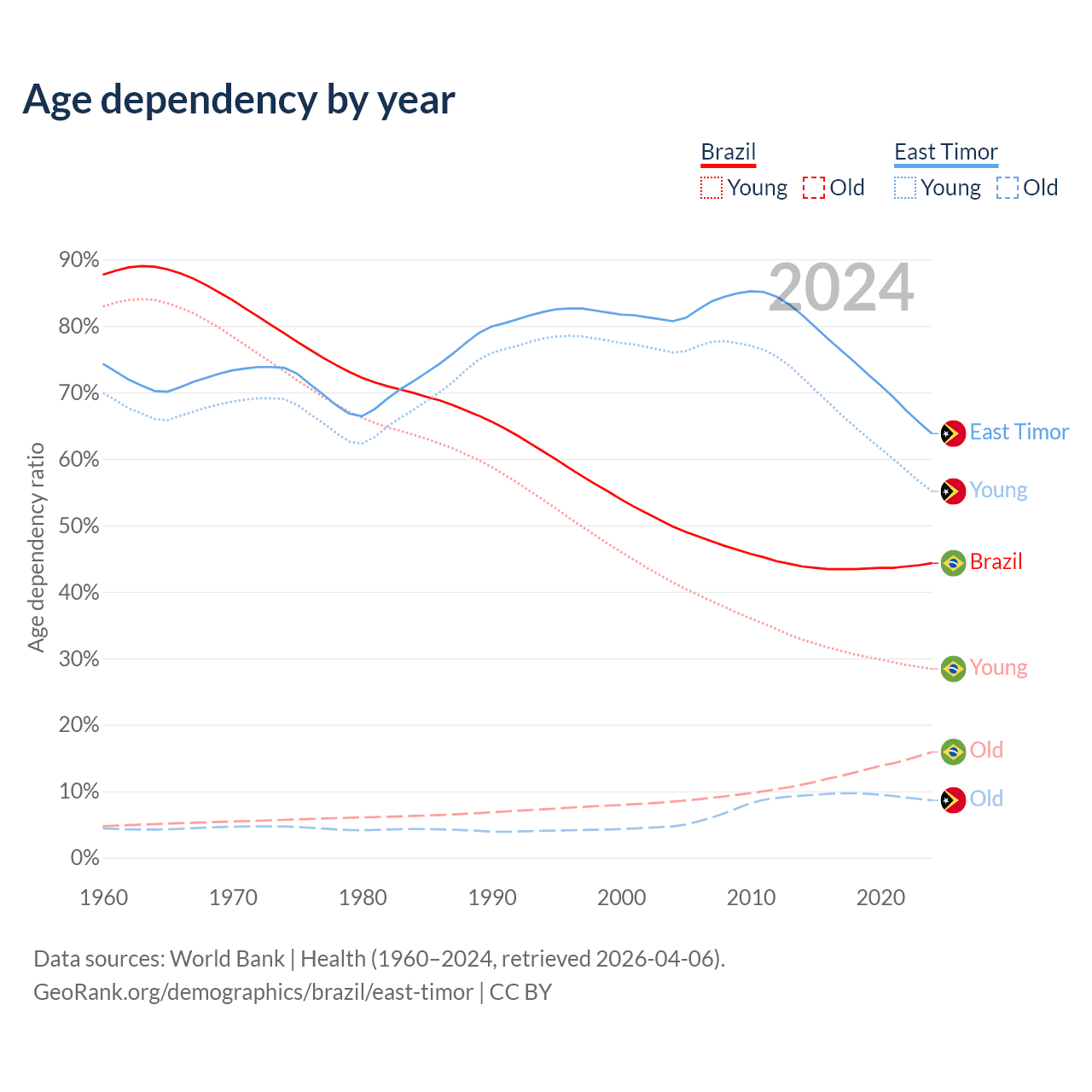 - The share of old-age demographic (65+) in Brazil is 11% vs 5.28% in East Timor.