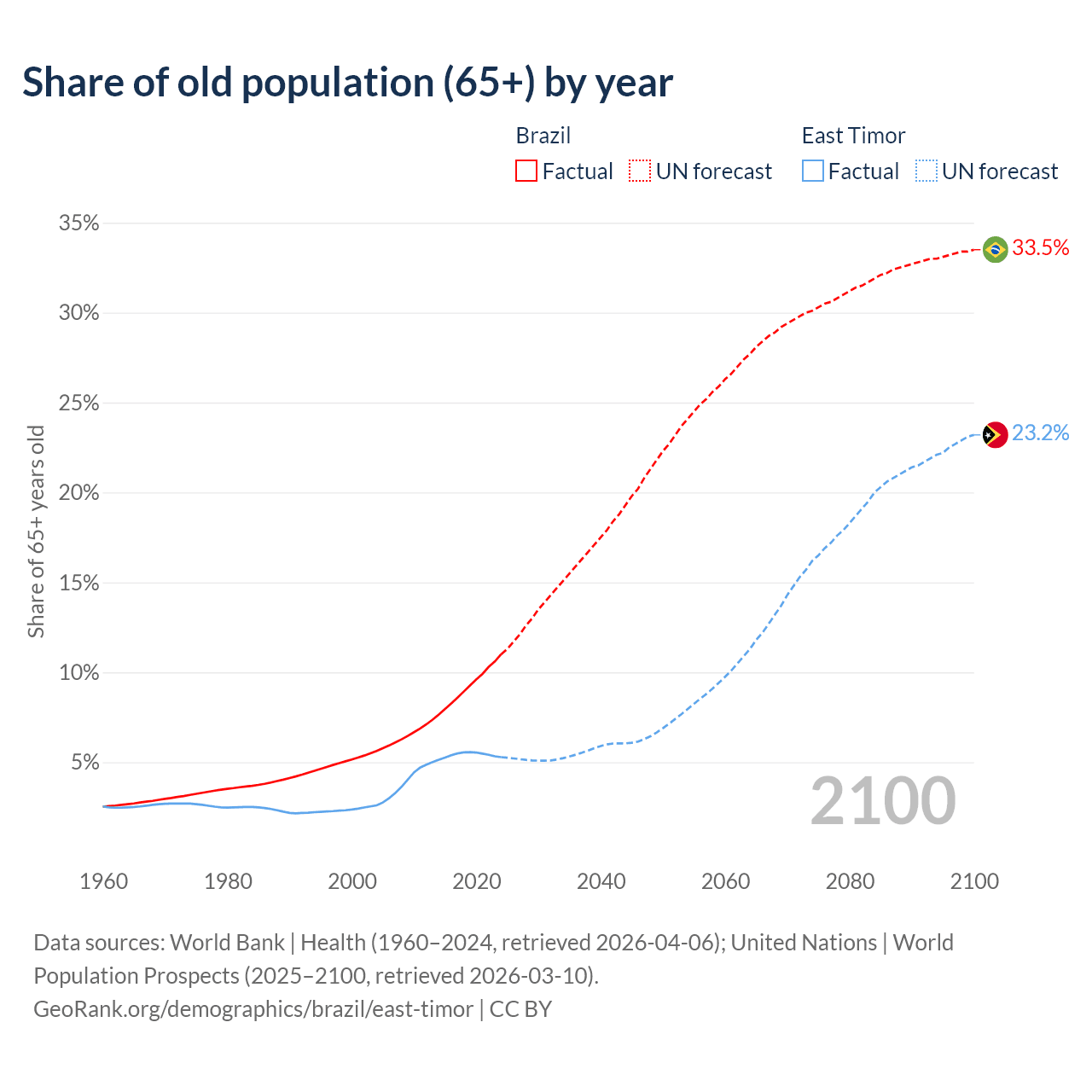 The share of older people aged 65 and over is 11% in Brazil and 5.28% in East Timor. Life expectancy in Brazil compared to East Timor .