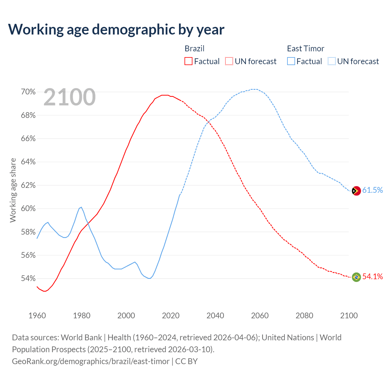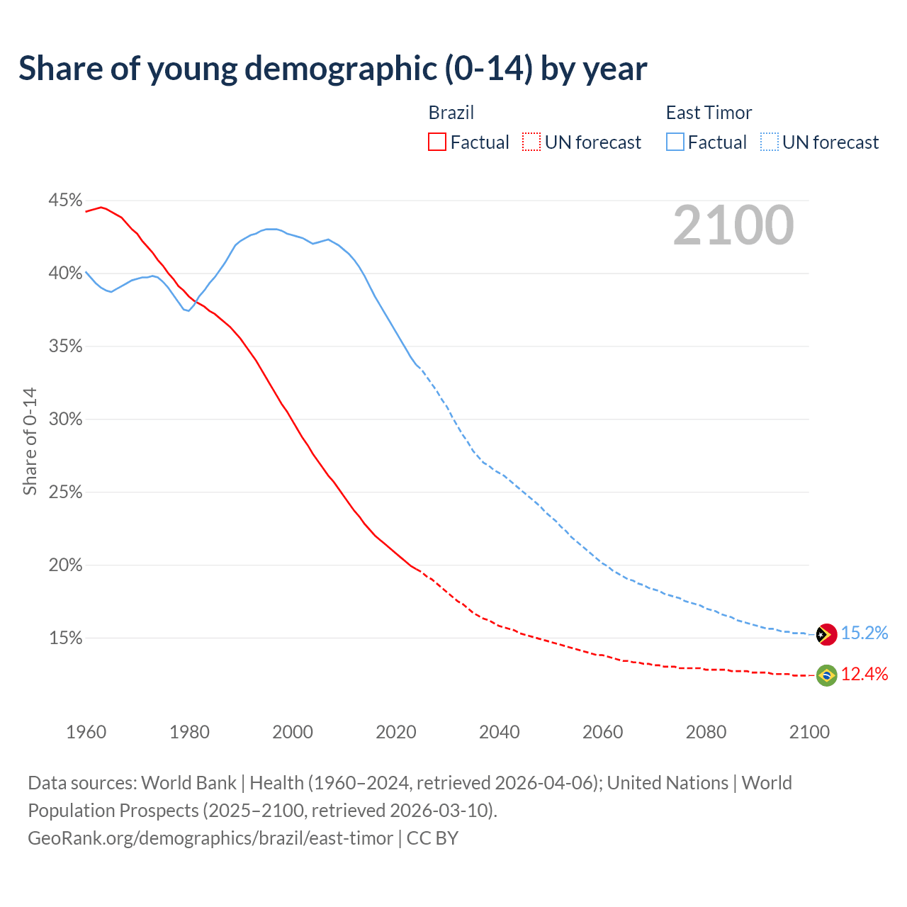 Median age Brazil vs East Timor, 1960-2100
