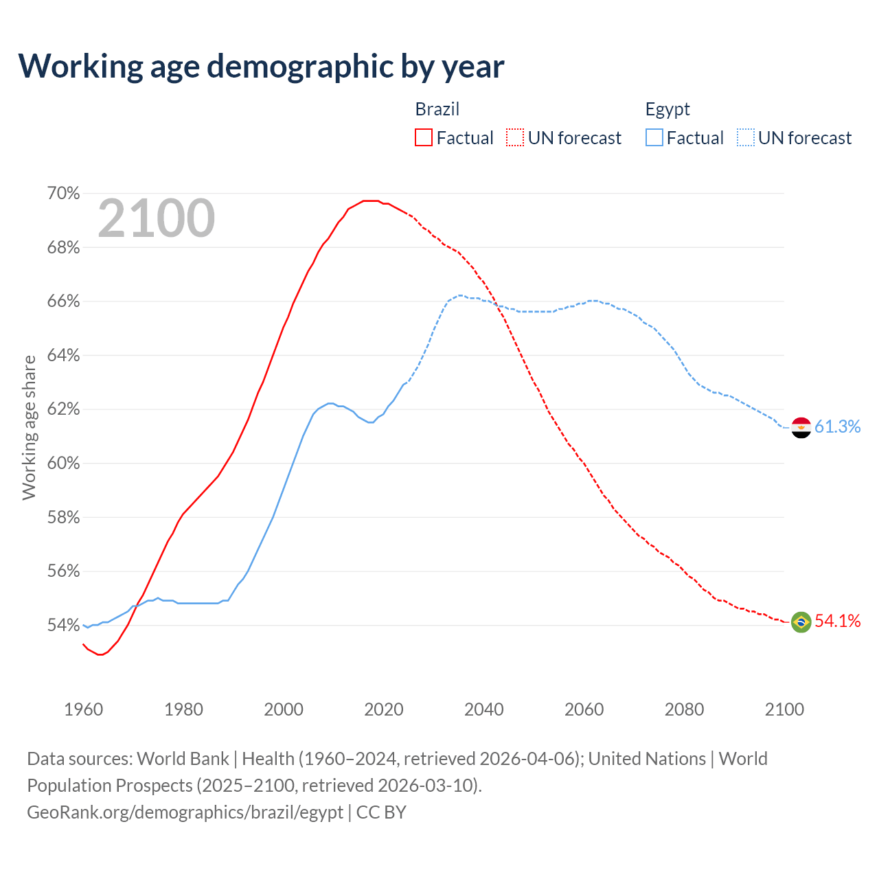Median age Brazil vs Egypt, 1960-2100