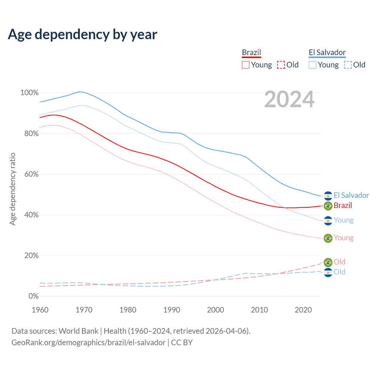 - Brazil is ranked 73/196 by median age (oldest to youngest) vs 115/196 for El Salvador.