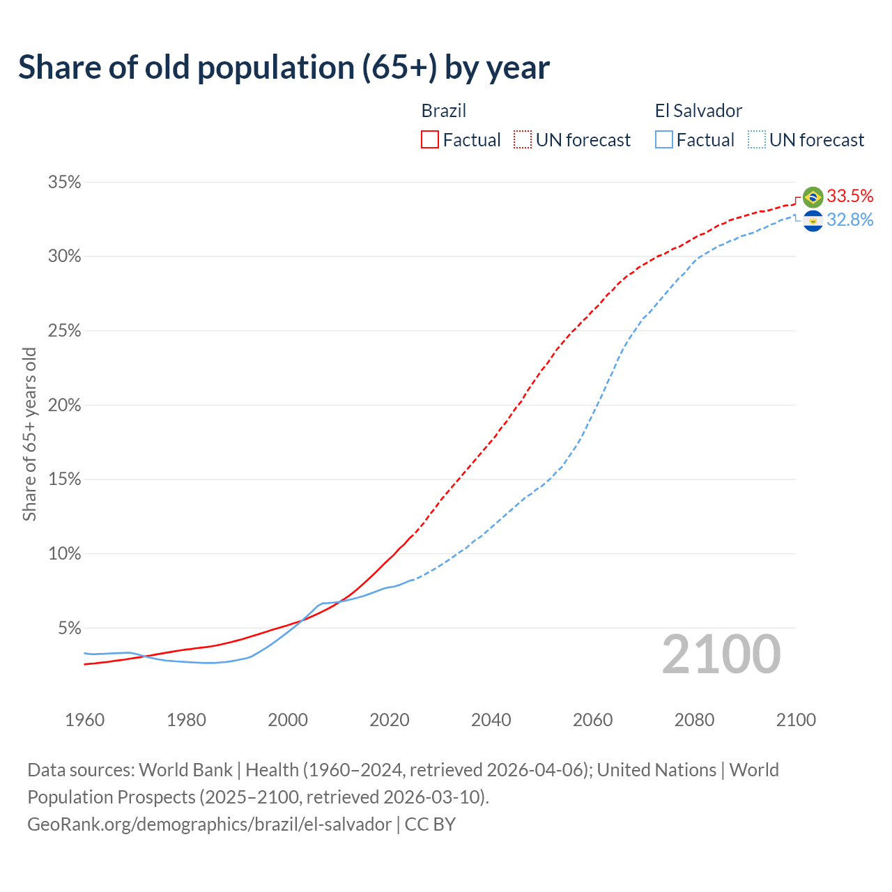 The share of older people aged 65 and over is 11% in Brazil and 8.15% in El Salvador. Life expectancy in Brazil compared to El Salvador .