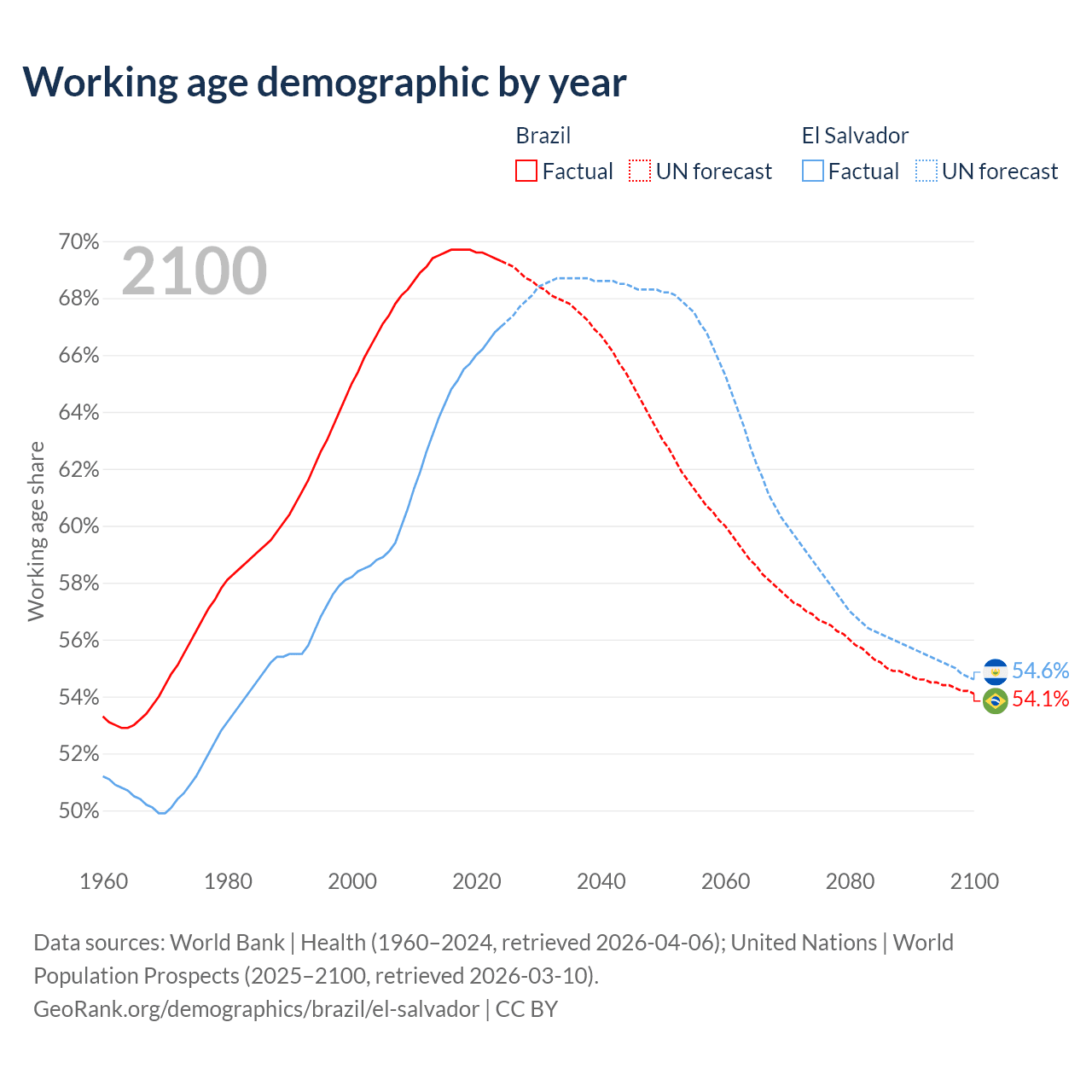 - Brazil has 148M working age adults (aged 15-64) vs 4.29M in El Salvador.