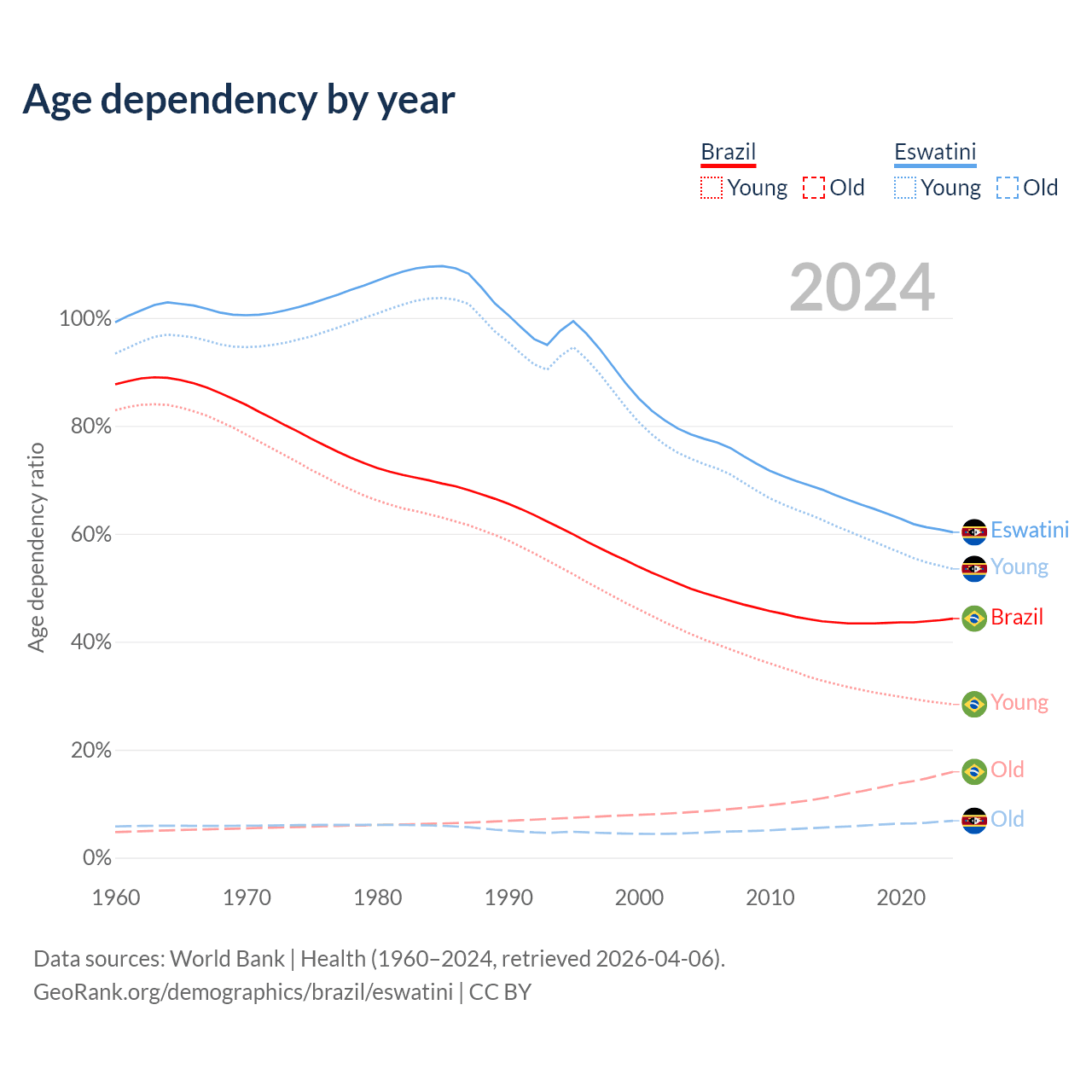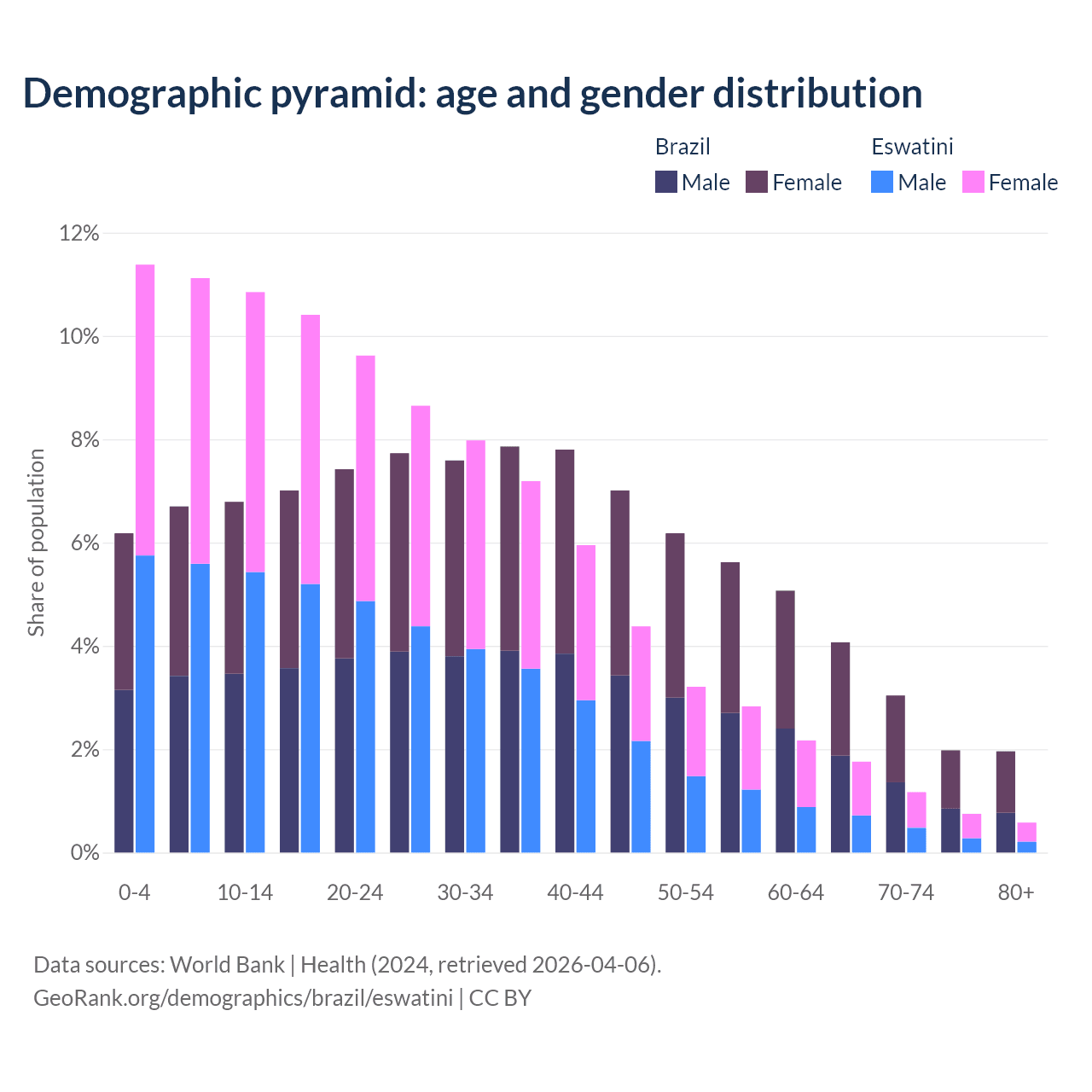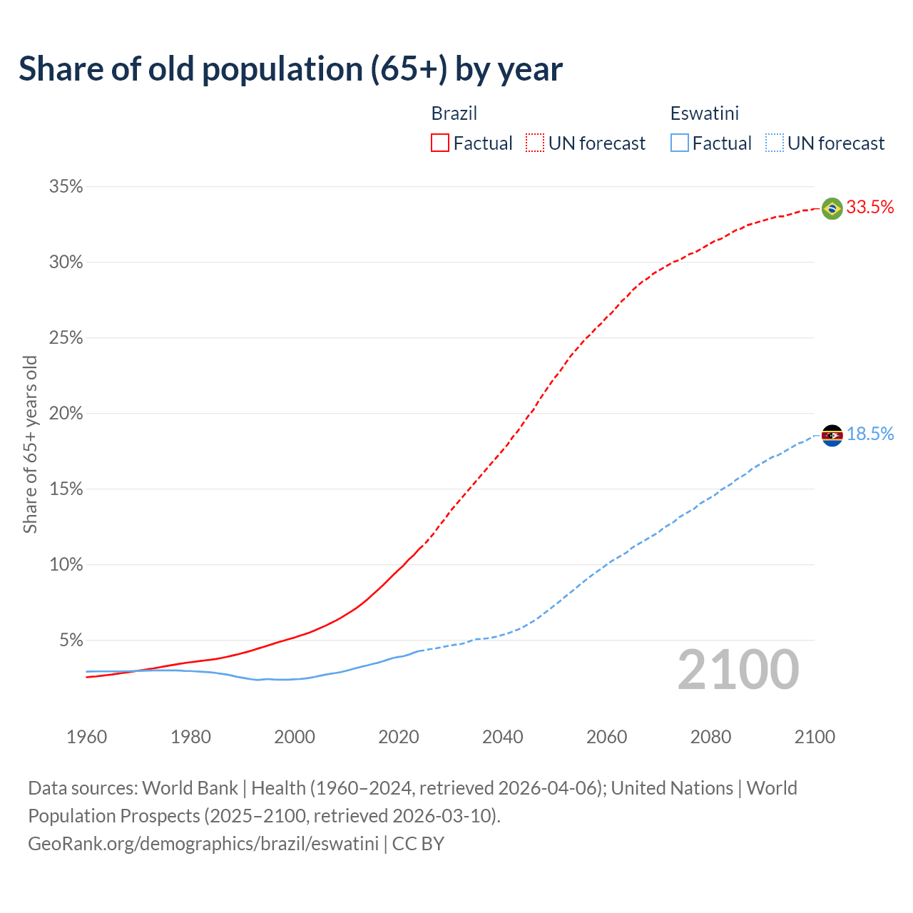 The share of older people aged 65 and over is 11% in Brazil and 4.26% in Eswatini. Life expectancy in Brazil compared to Eswatini .