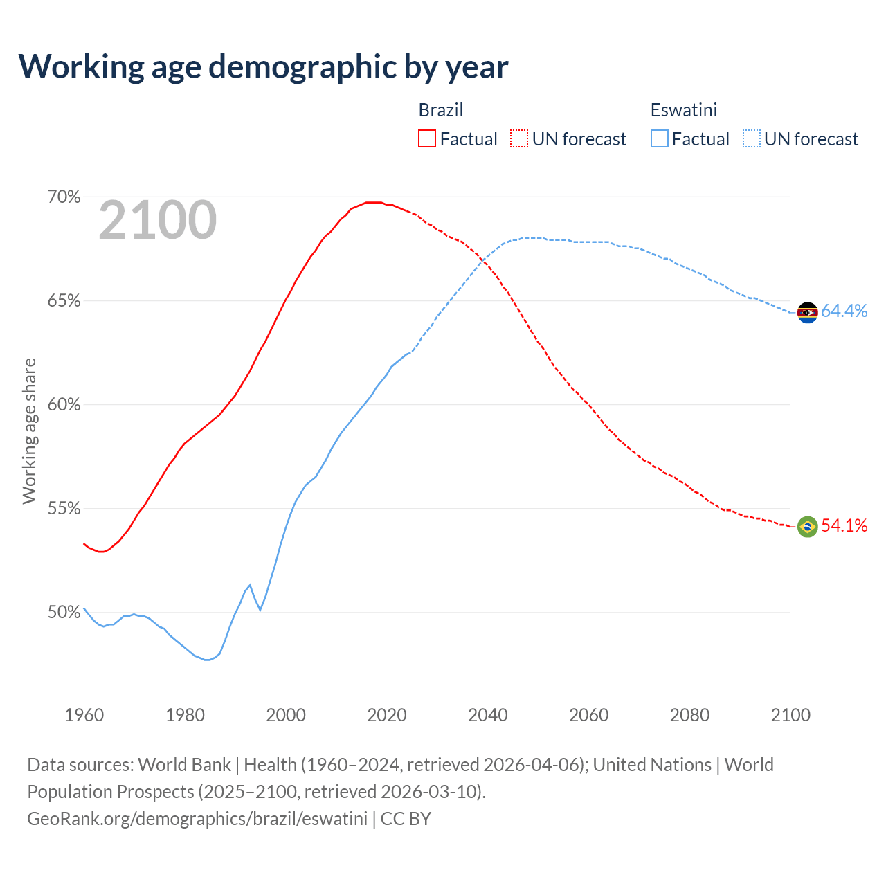 - Brazil has 148M working age adults (aged 15-64) vs 794K in Eswatini.