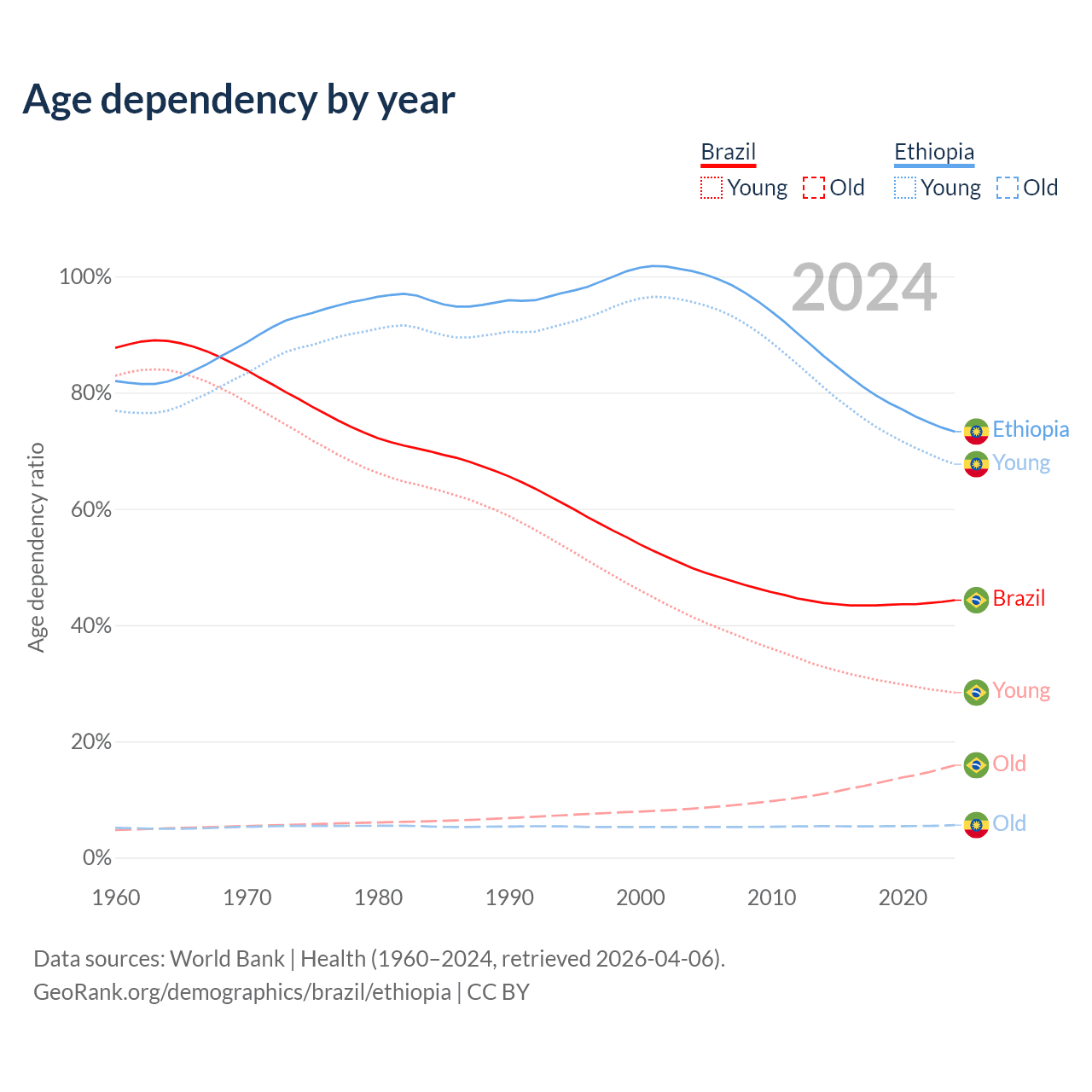 - The share of old-age demographic (65+) in Brazil is 11% vs 3.23% in Ethiopia.