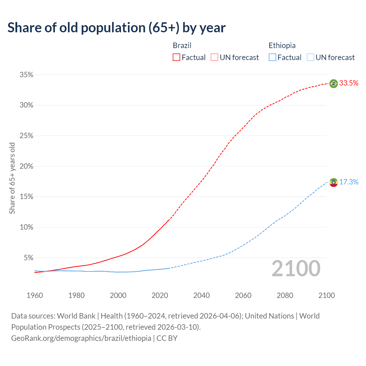 The share of older people aged 65 and over is 11% in Brazil and 3.23% in Ethiopia. Life expectancy in Brazil compared to Ethiopia .