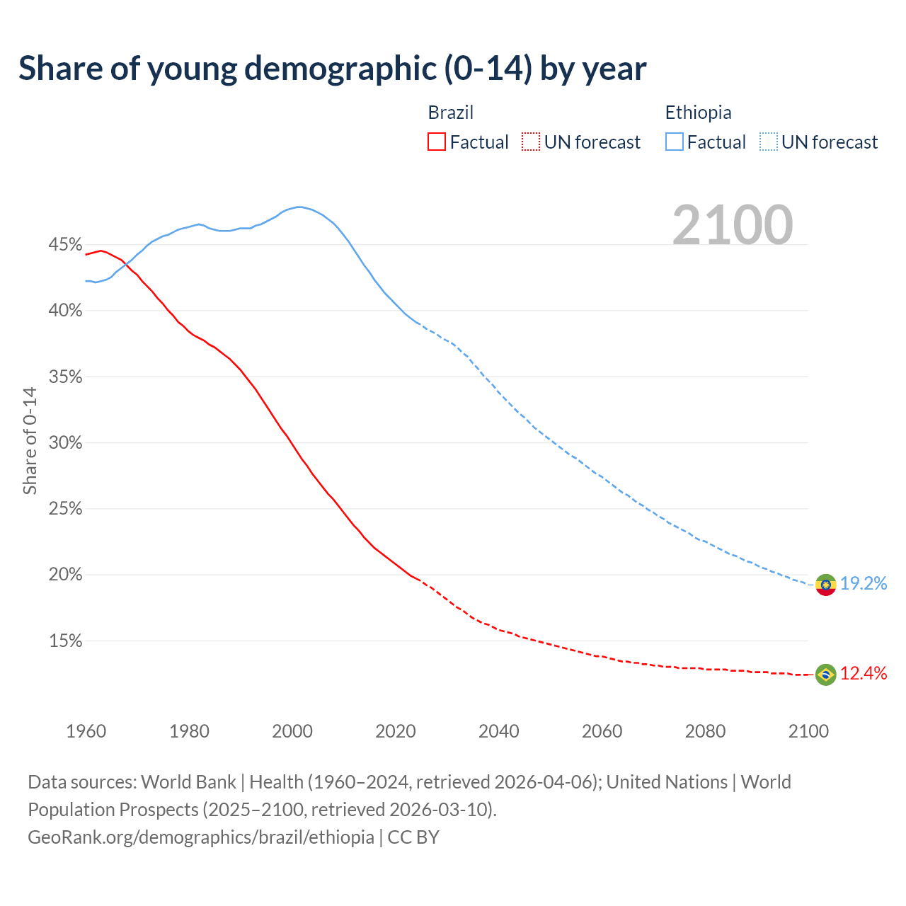 - The total fertility rate is 1.62 in Brazil compared to 3.99 in Ethiopia.