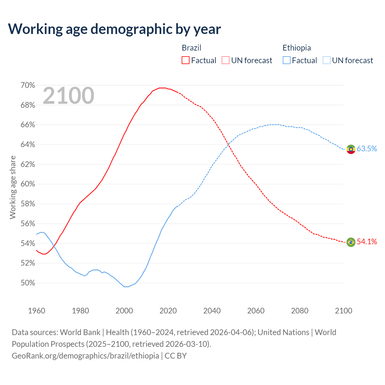 Median age Brazil vs Ethiopia, 1960-2100