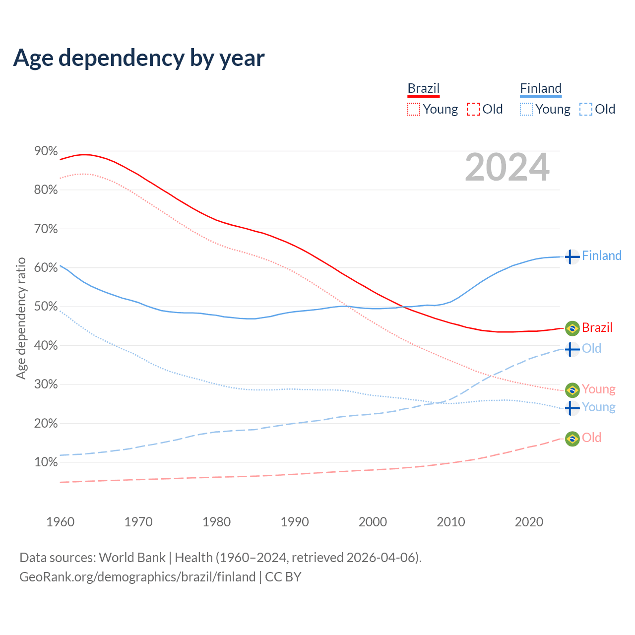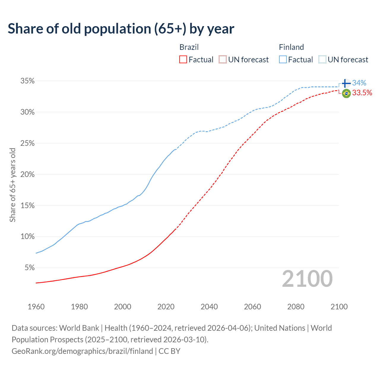 The share of older people aged 65 and over is 11% in Brazil and 23.9% in Finland. Life expectancy in Brazil compared to Finland .