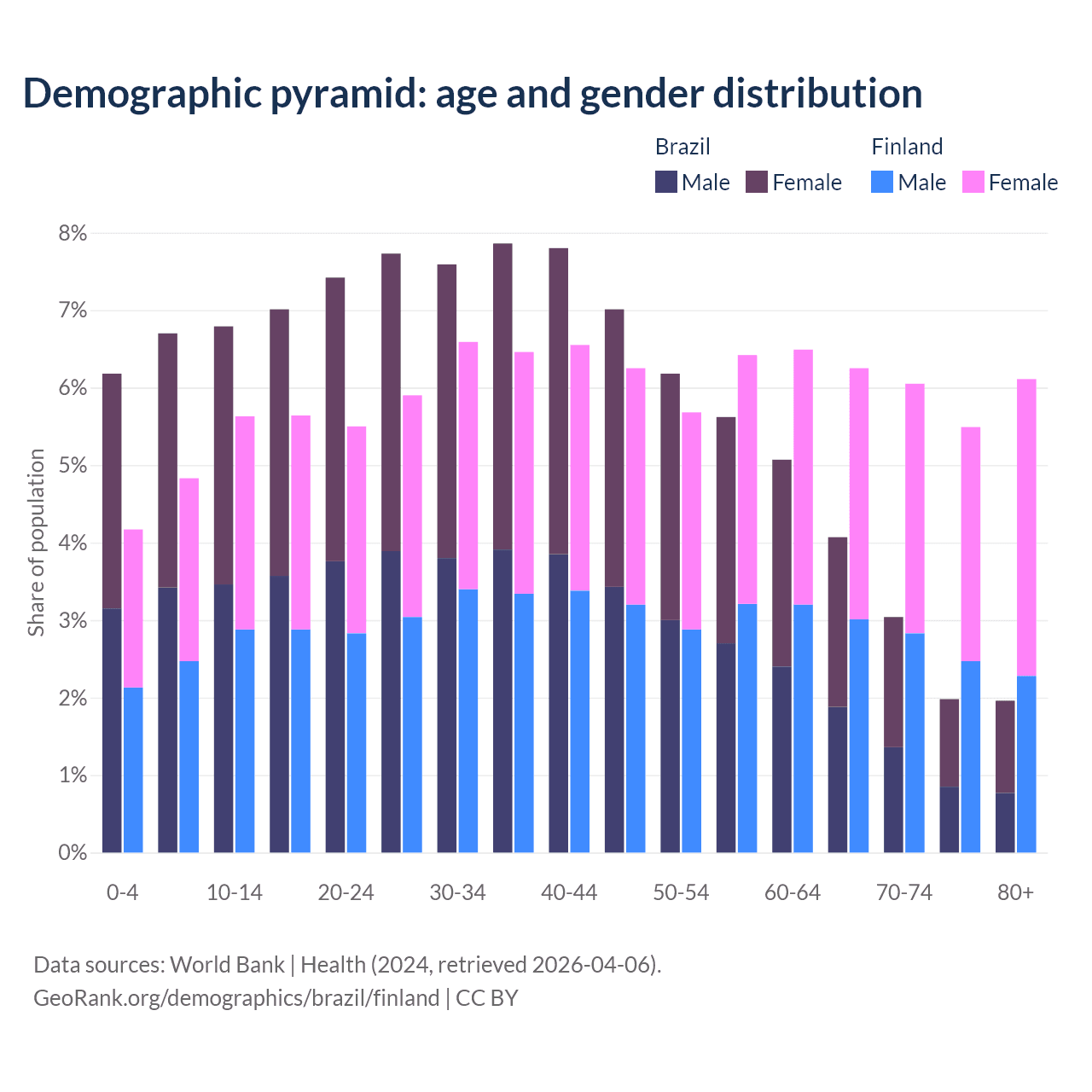 - Brazil is ranked 73/196 by median age (oldest to youngest) vs 22/196 for Finland.