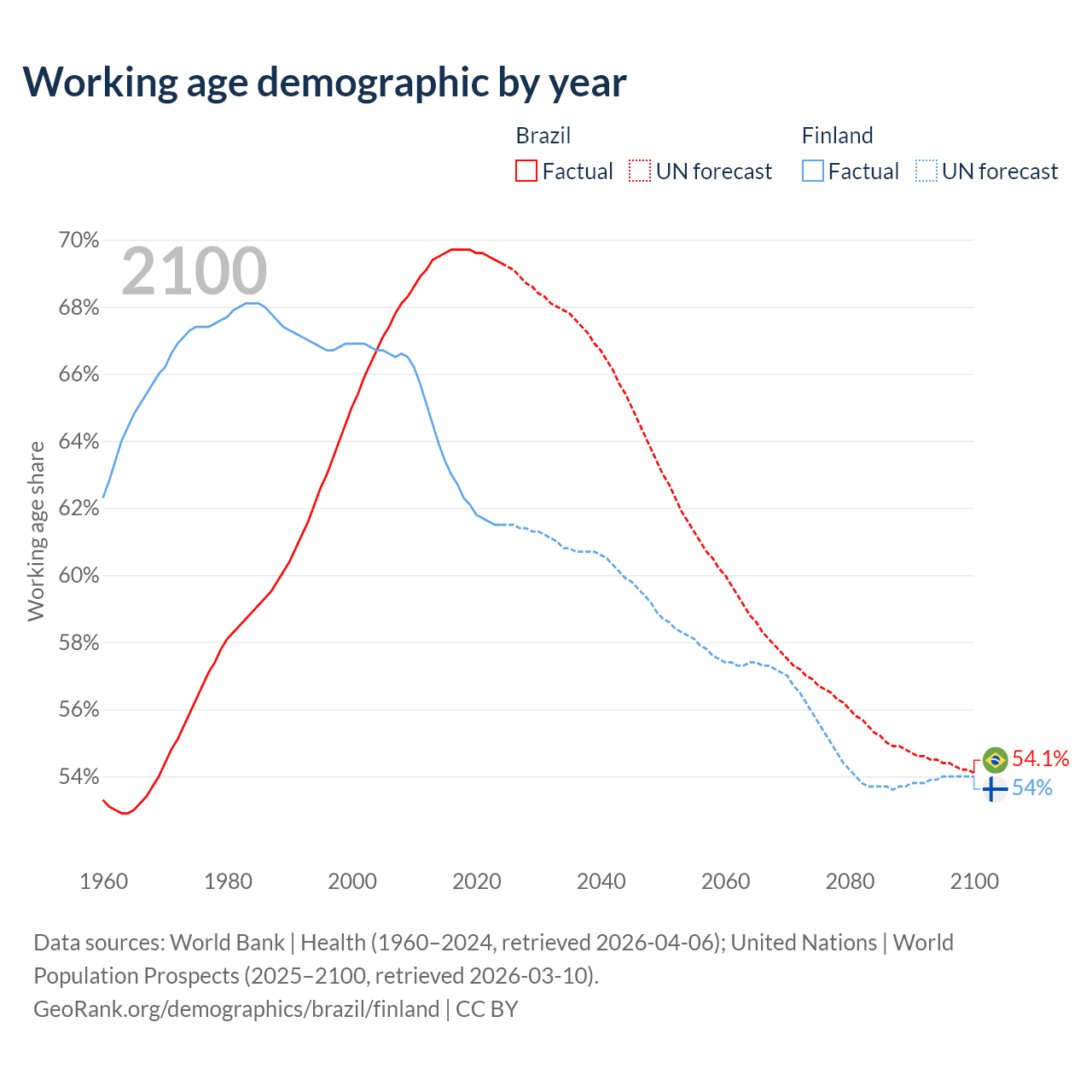- Brazil has 148M working age adults (aged 15-64) vs 3.46M in Finland.