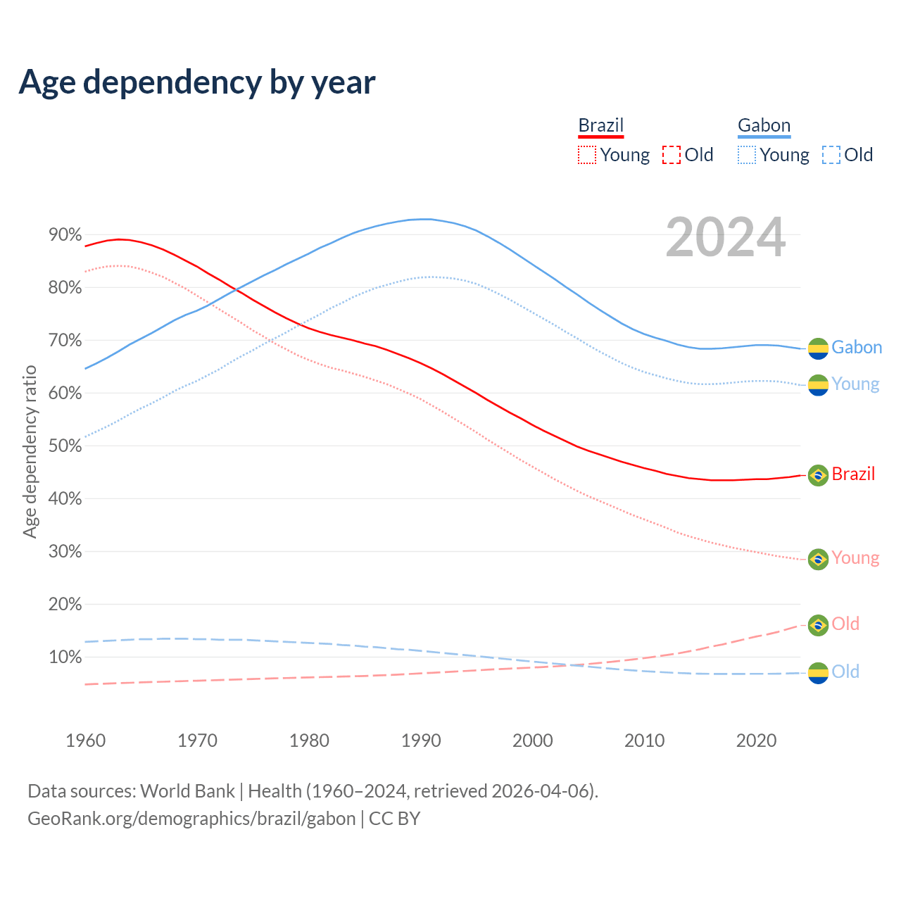 - The share of old-age demographic (65+) in Brazil is 11% vs 4.08% in Gabon.