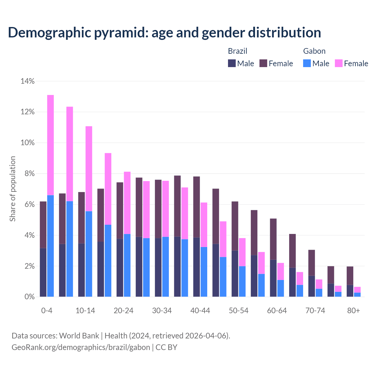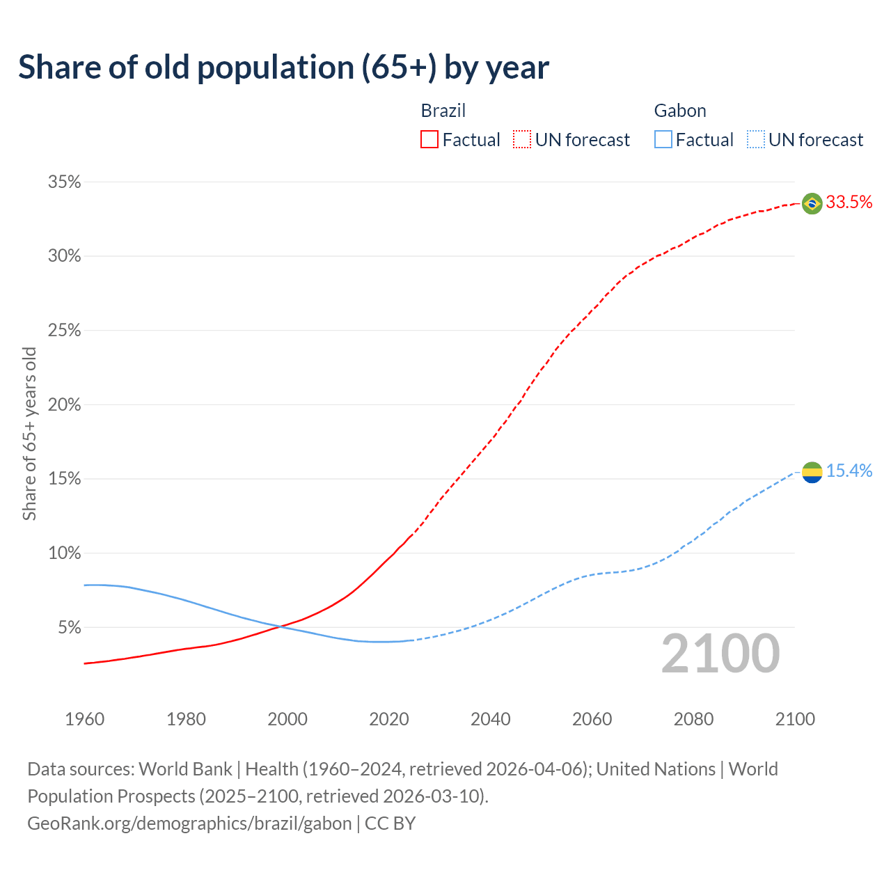 The share of older people aged 65 and over is 11% in Brazil and 4.08% in Gabon. Life expectancy in Brazil compared to Gabon .
