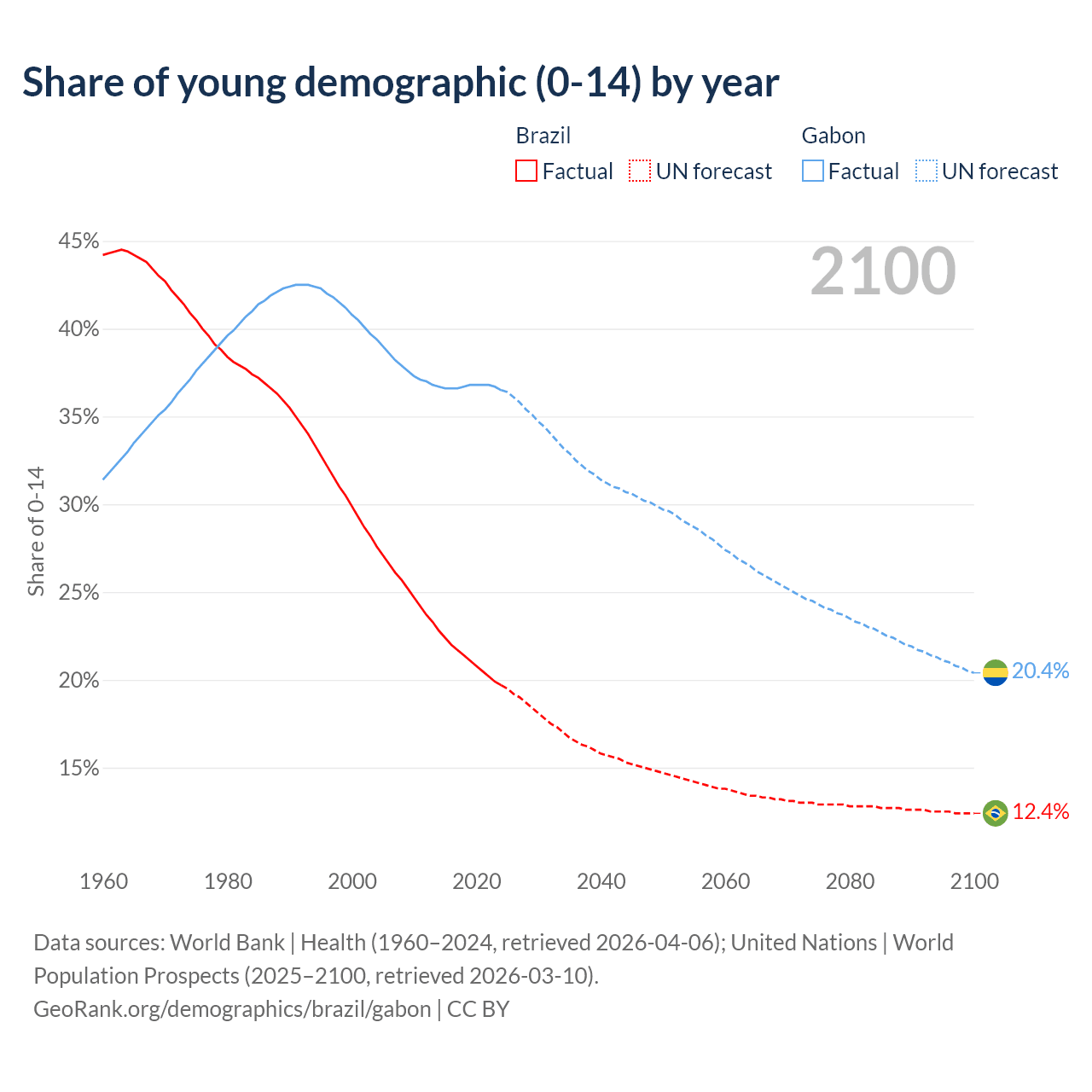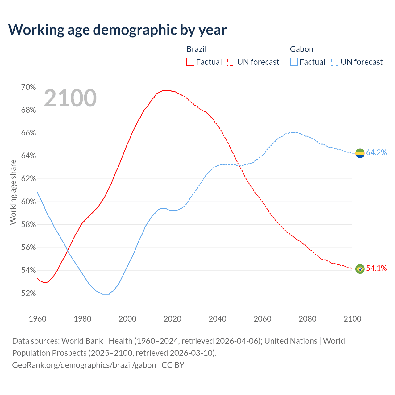 Median age Brazil vs Gabon, 1960-2100