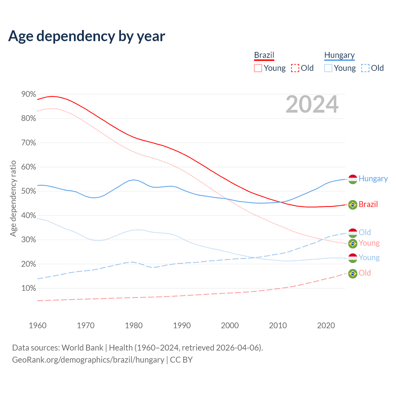 - Brazil is ranked 73/196 by median age (oldest to youngest) vs 17/196 for Hungary.