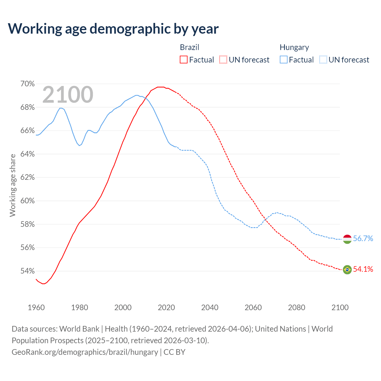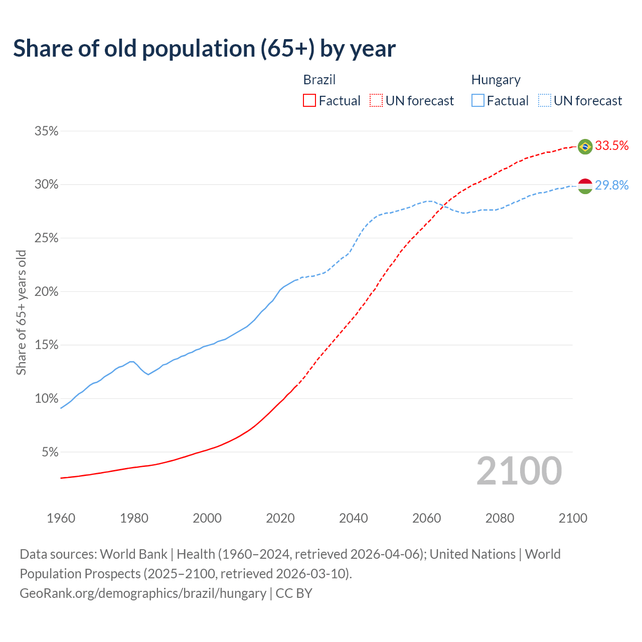 Median age Brazil vs Hungary, 1960-2100