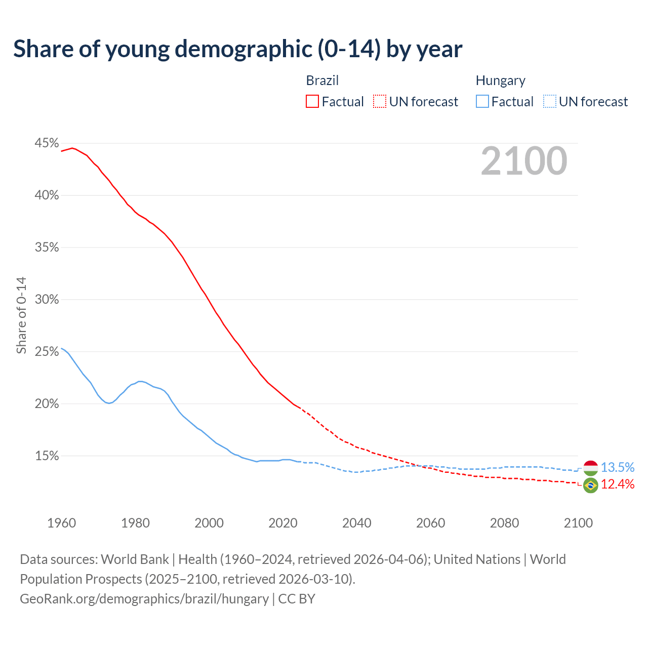 - The share of young demographic (0-15 years old) in Brazil is 19.7% vs 14.4% in Hungary.