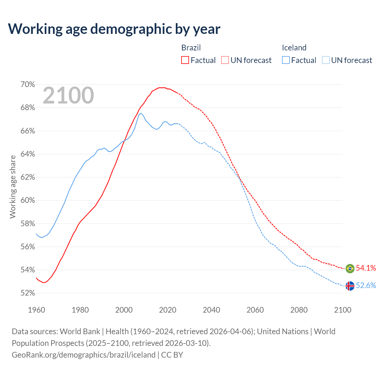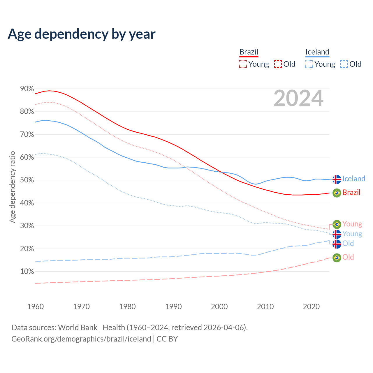 - The share of young demographic (0-15 years old) in Brazil is 19.7% vs 17.8% in Iceland.
