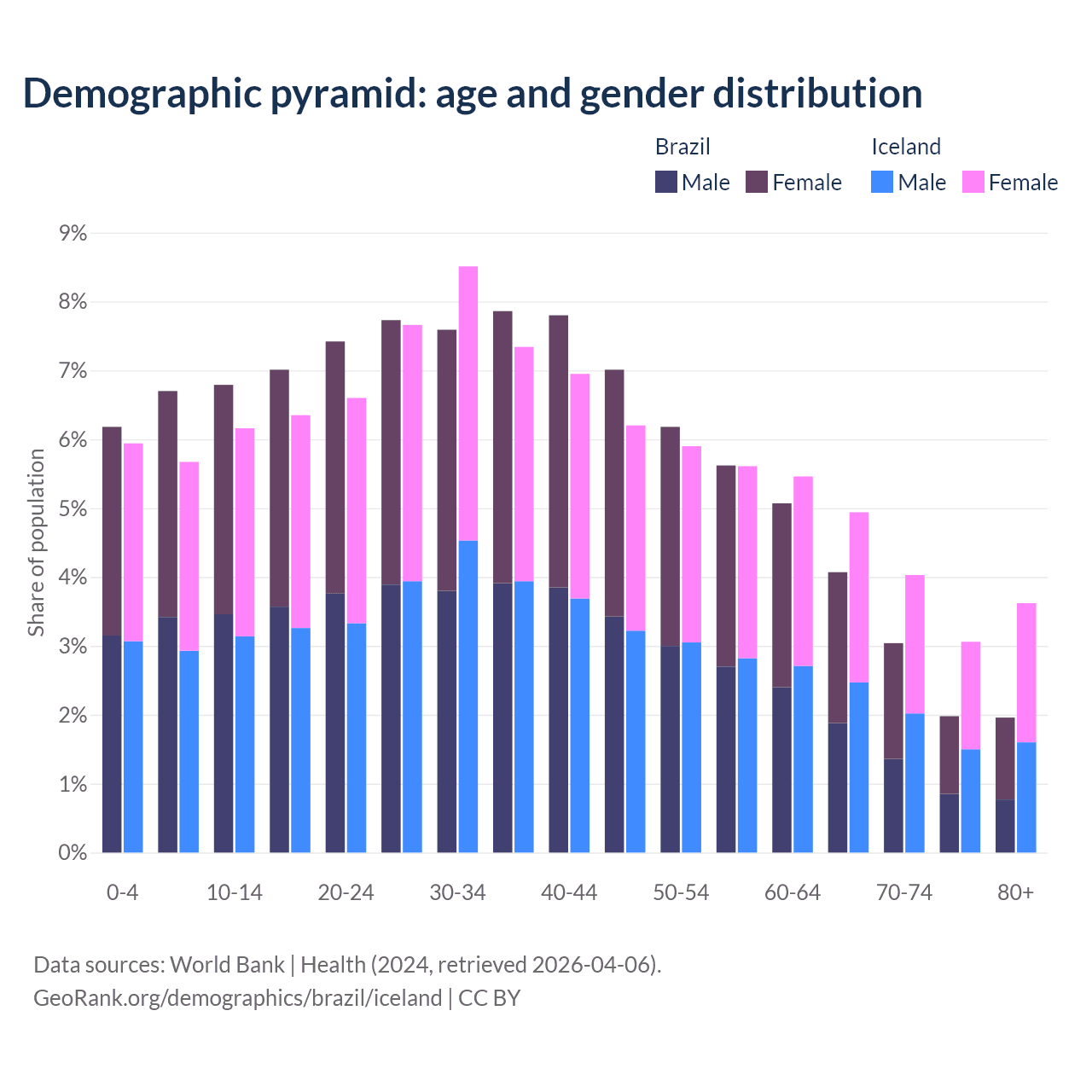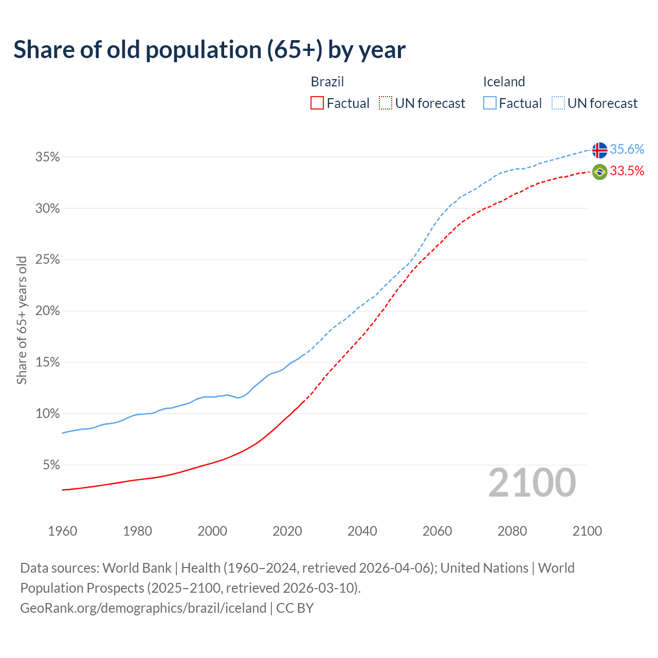 The share of older people aged 65 and over is 11% in Brazil and 15.6% in Iceland. Life expectancy in Brazil compared to Iceland .