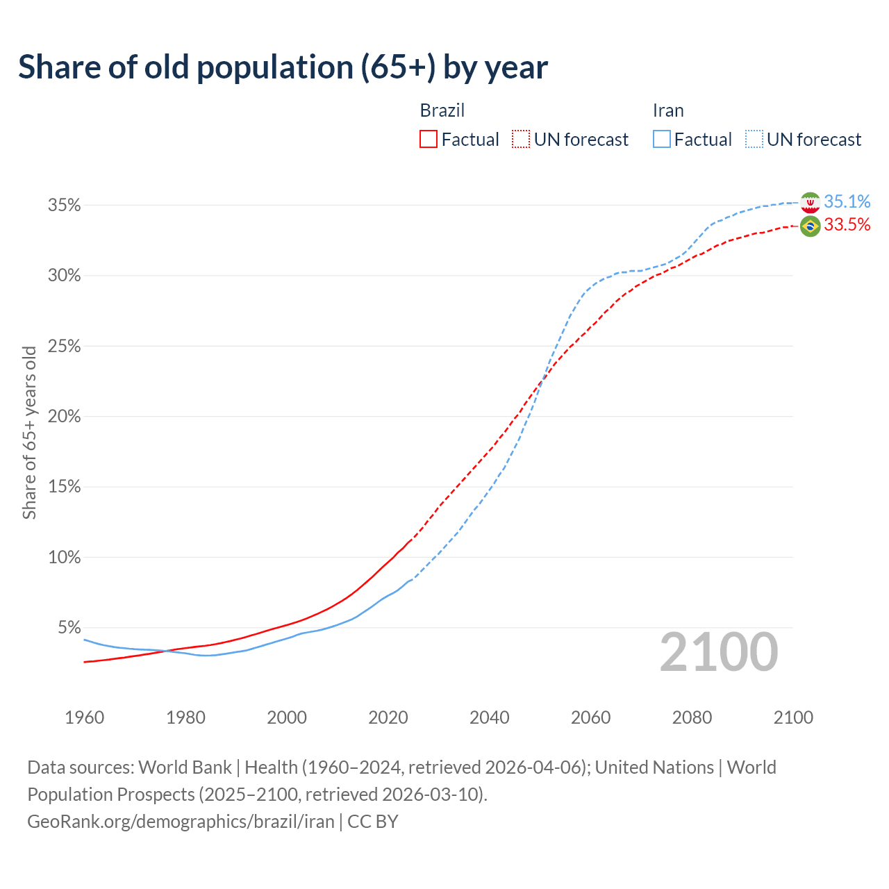 The share of older people aged 65 and over is 11% in Brazil and 8.24% in Iran. Life expectancy in Brazil compared to Iran .