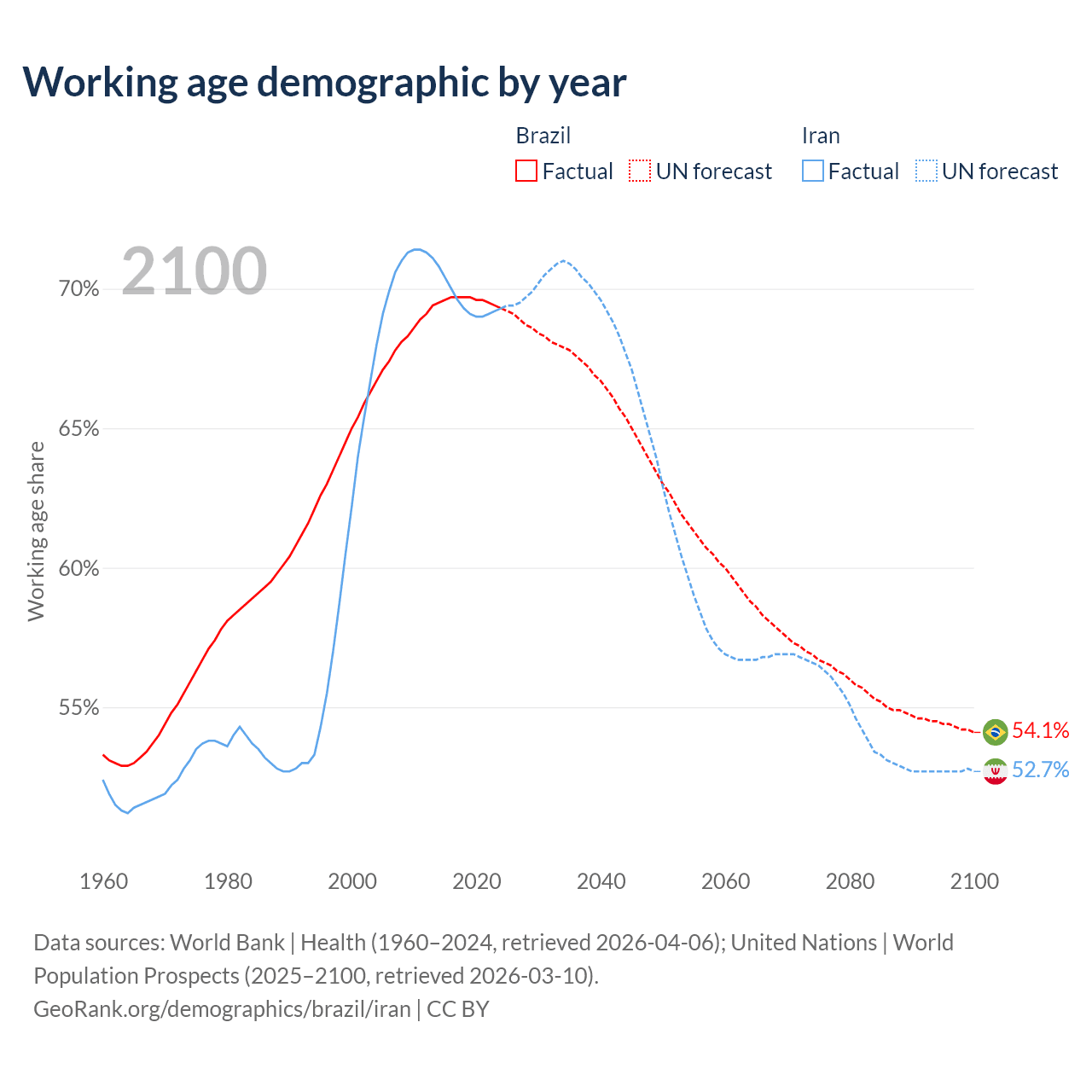 Median age Brazil vs Iran, 1960-2100