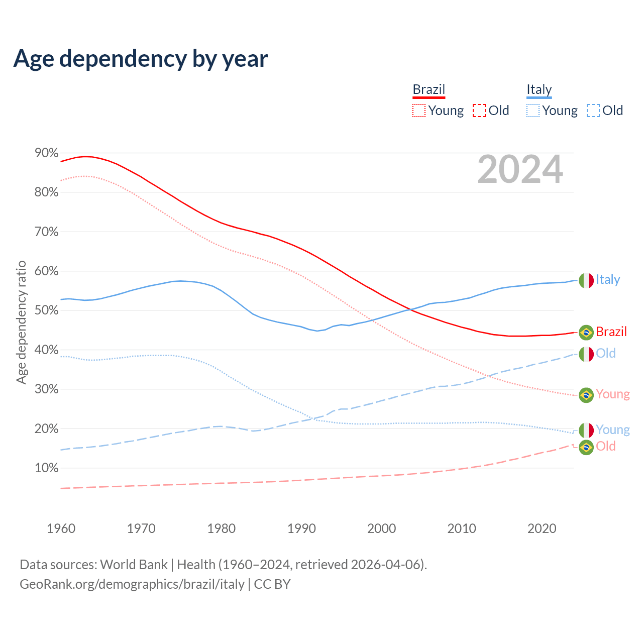 - Brazil is ranked 73/196 by median age (oldest to youngest) vs 4/196 for Italy.