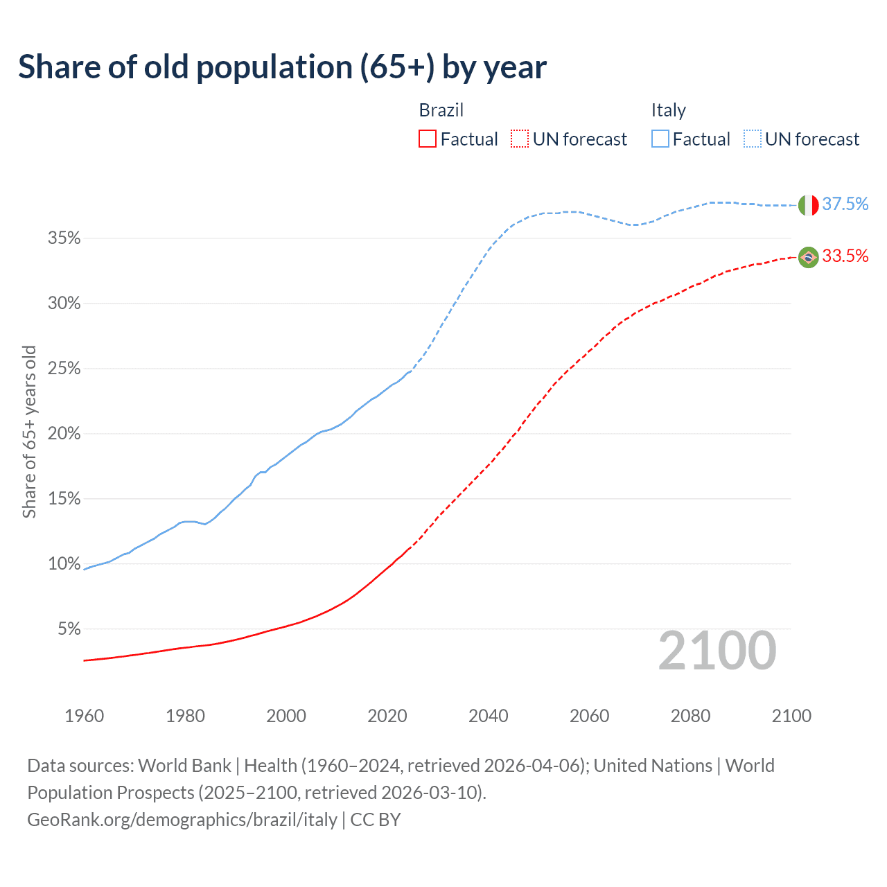 The share of older people aged 65 and over is 11% in Brazil and 24.6% in Italy. Life expectancy in Brazil compared to Italy .