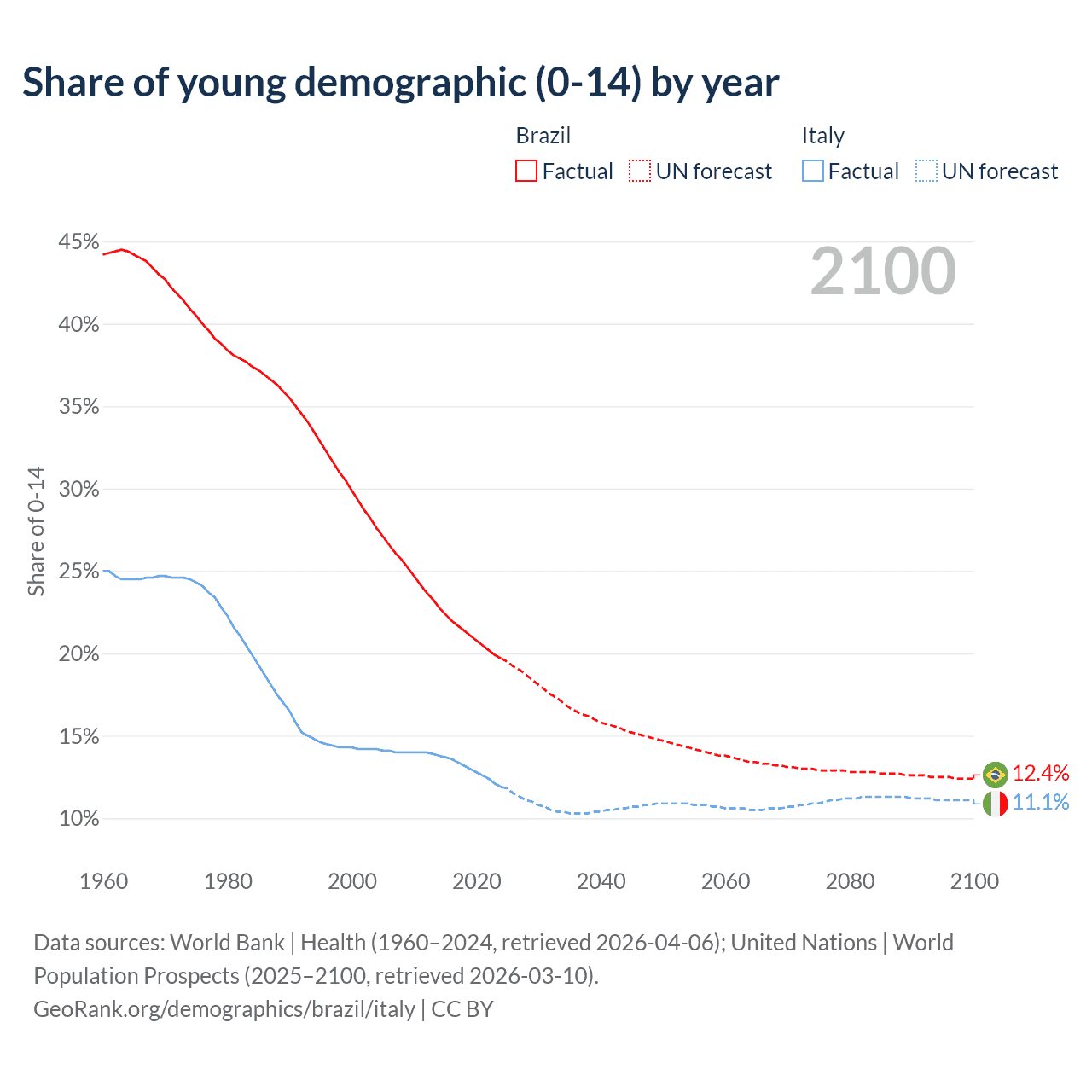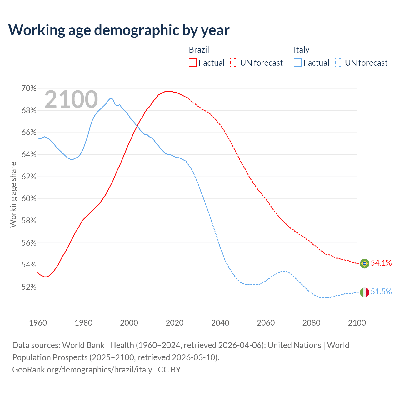 Median age Brazil vs Italy, 1960-2100