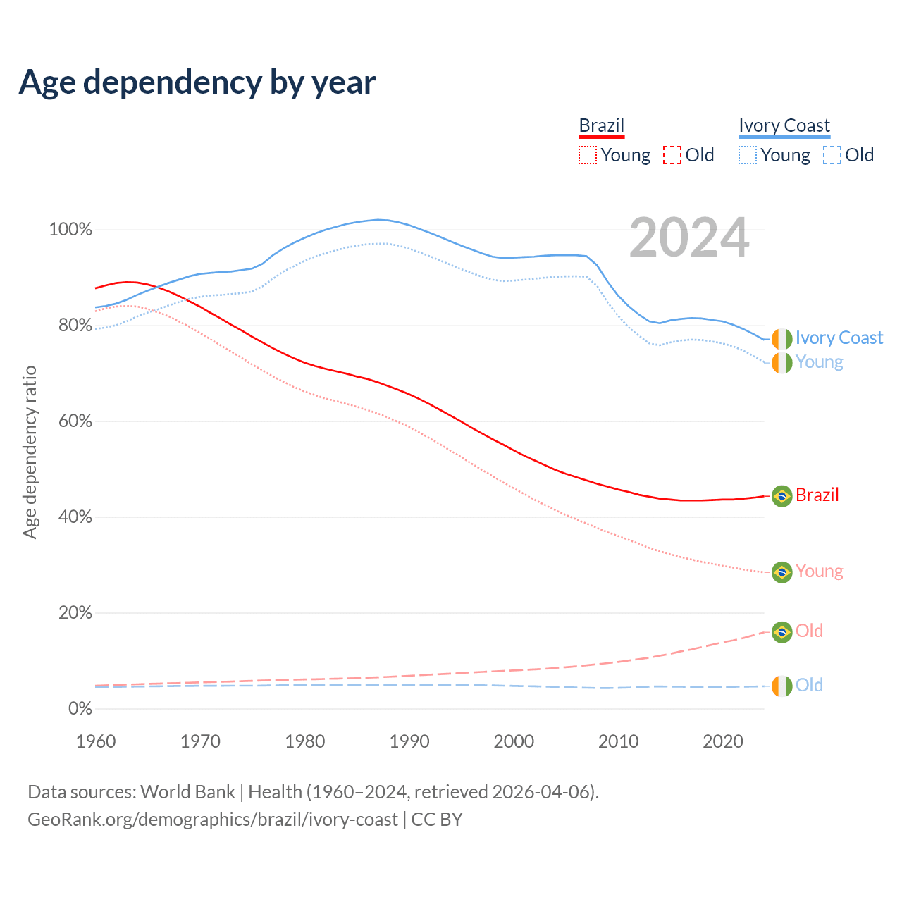 - Brazil is ranked 73/196 by median age (oldest to youngest) vs 175/196 for Ivory Coast.
