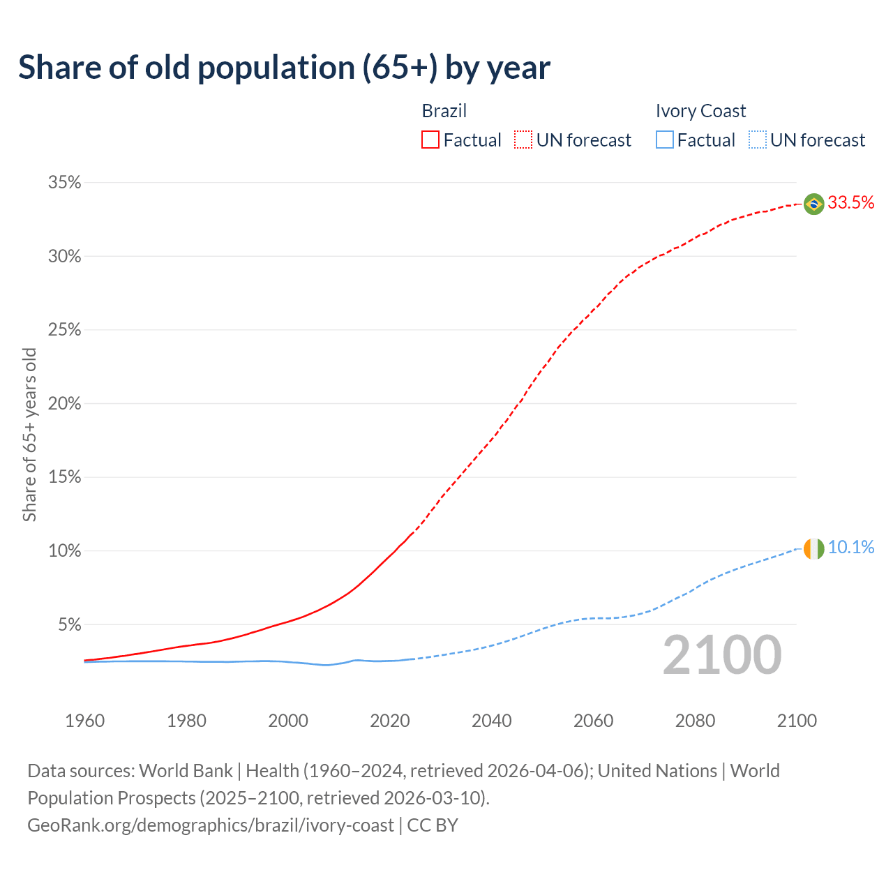 The share of older people aged 65 and over is 11% in Brazil and 2.61% in Ivory Coast. Life expectancy in Brazil compared to Ivory Coast .