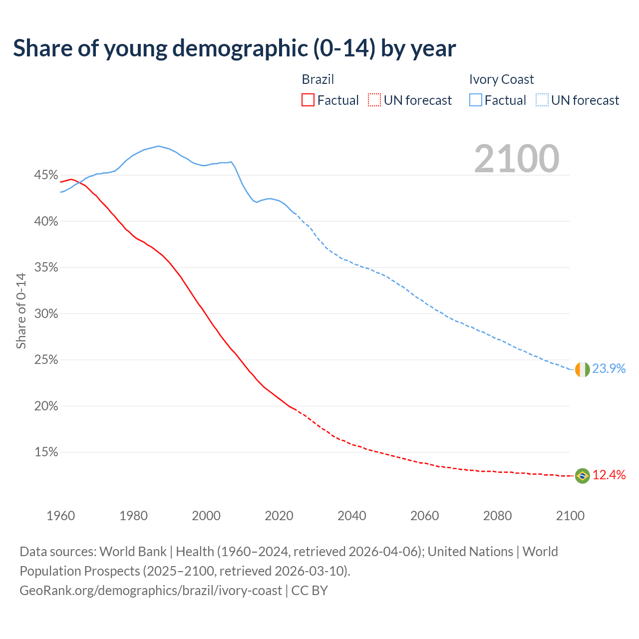 - The share of young demographic (0-15 years old) in Brazil is 19.7% vs 40.9% in Ivory Coast.