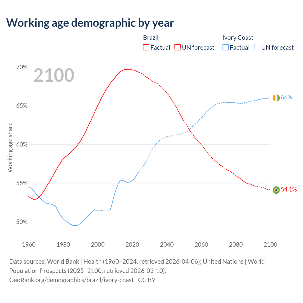 - Brazil has 148M working age adults (aged 15-64) vs 19.1M in Ivory Coast.