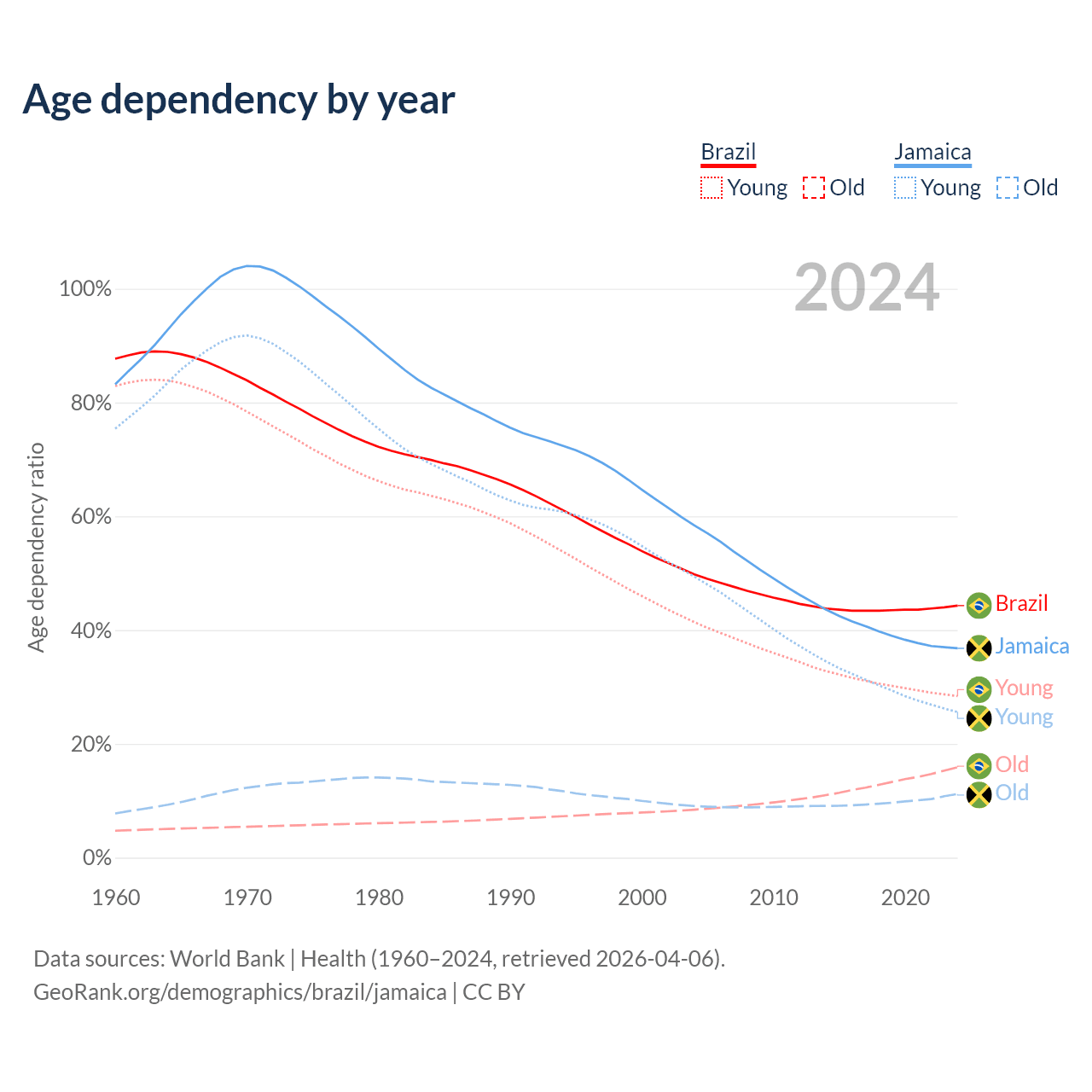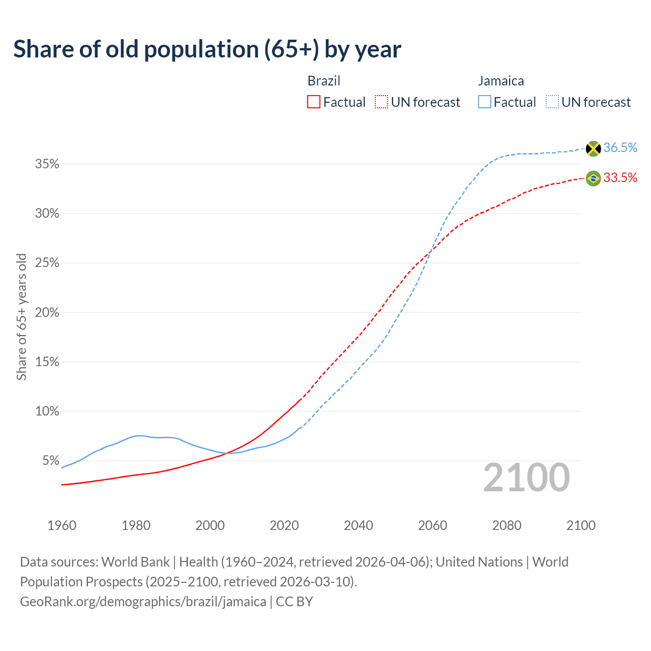 The share of older people aged 65 and over is 11% in Brazil and 8.21% in Jamaica. Life expectancy in Brazil compared to Jamaica .