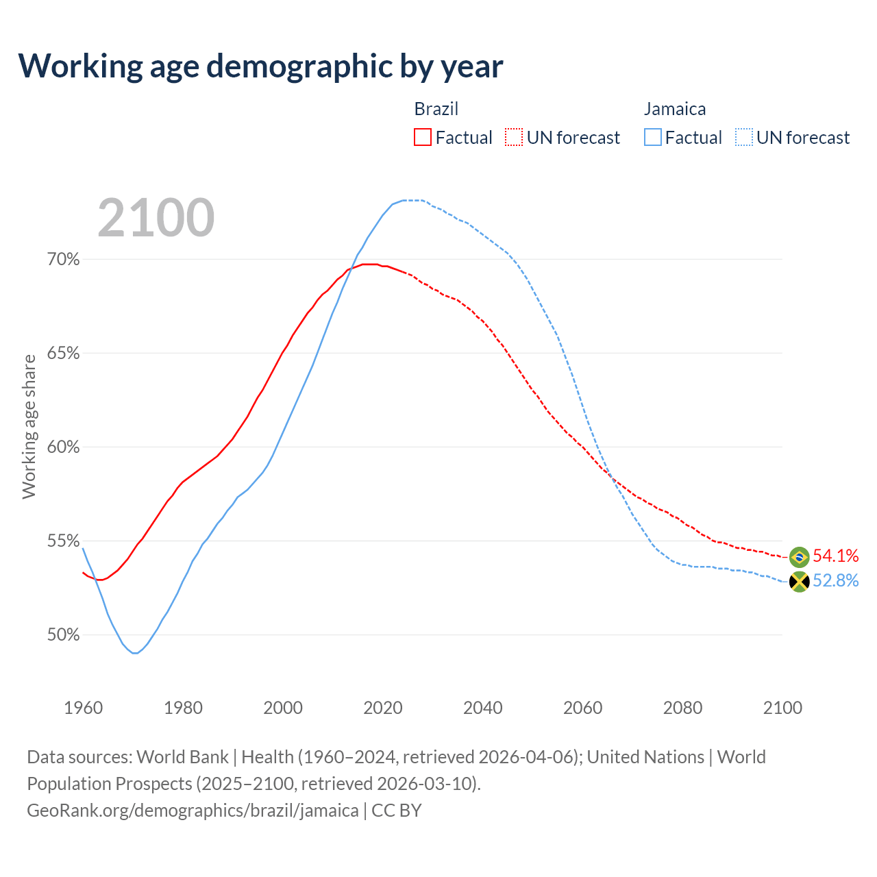 - Brazil has 148M working age adults (aged 15-64) vs 2.07M in Jamaica.