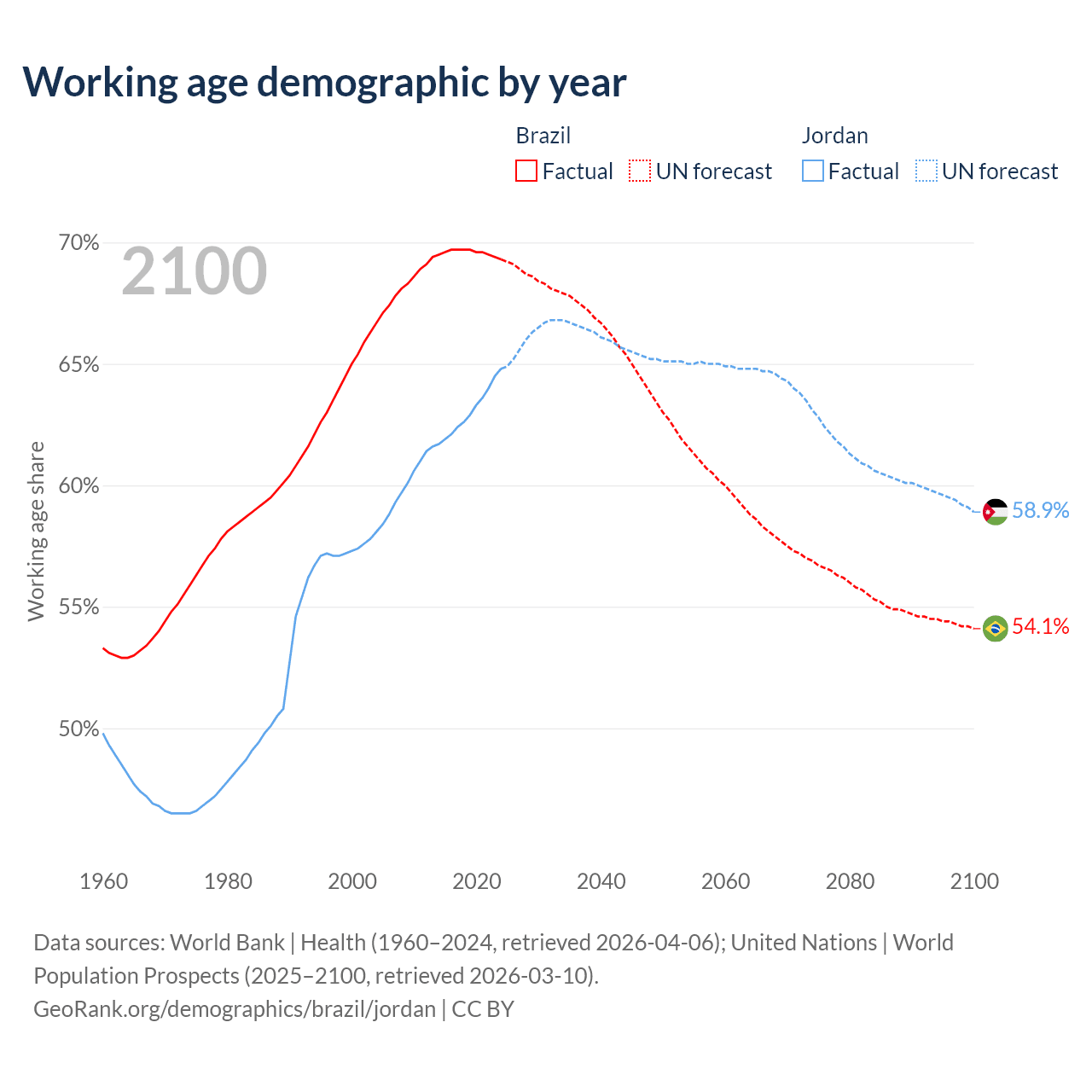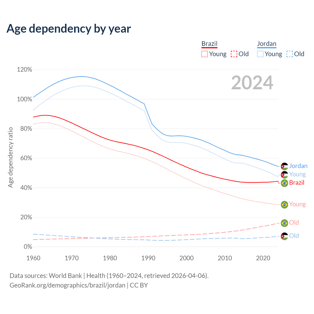 - Brazil is ranked 73/196 by median age (oldest to youngest) vs 131/196 for Jordan.