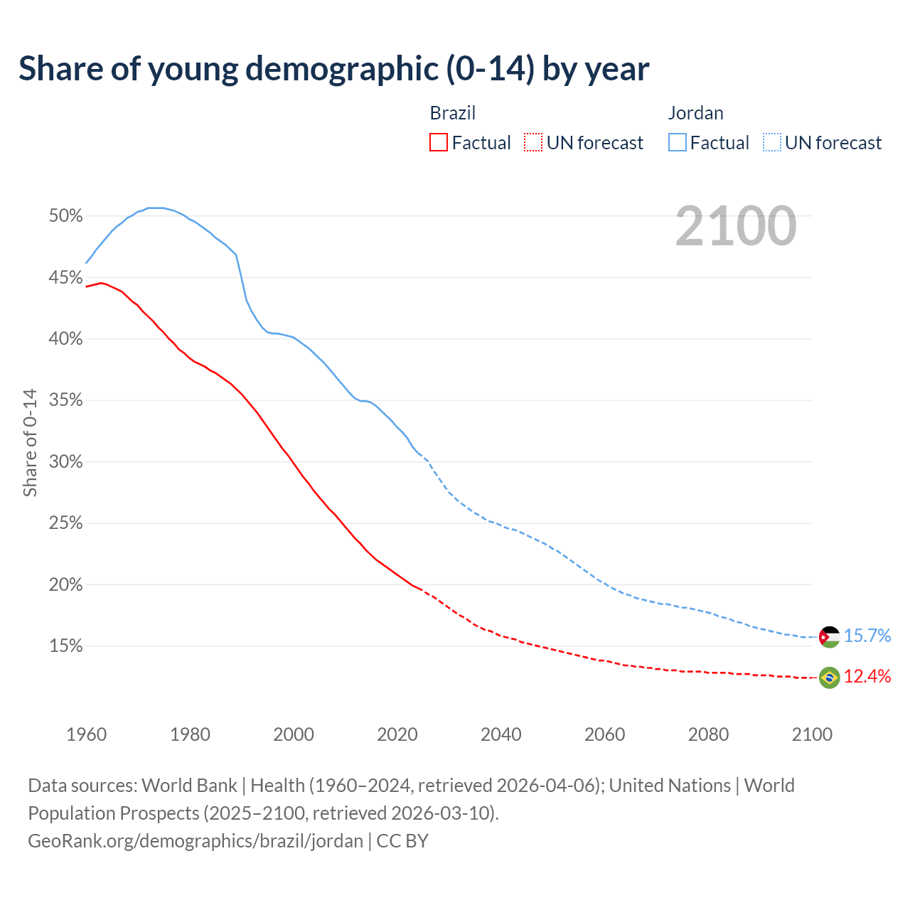 - The share of young demographic (0-15 years old) in Brazil is 19.7% vs 30.7% in Jordan.