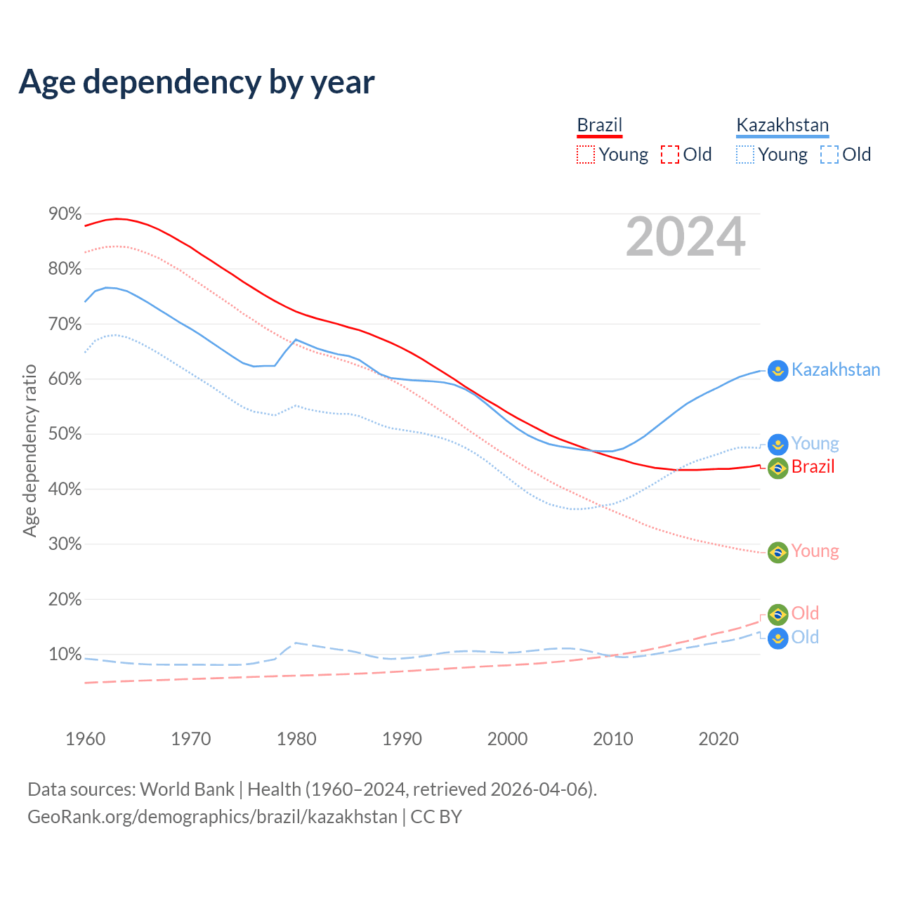 - Brazil is ranked 73/196 by median age (oldest to youngest) vs 99/196 for Kazakhstan.