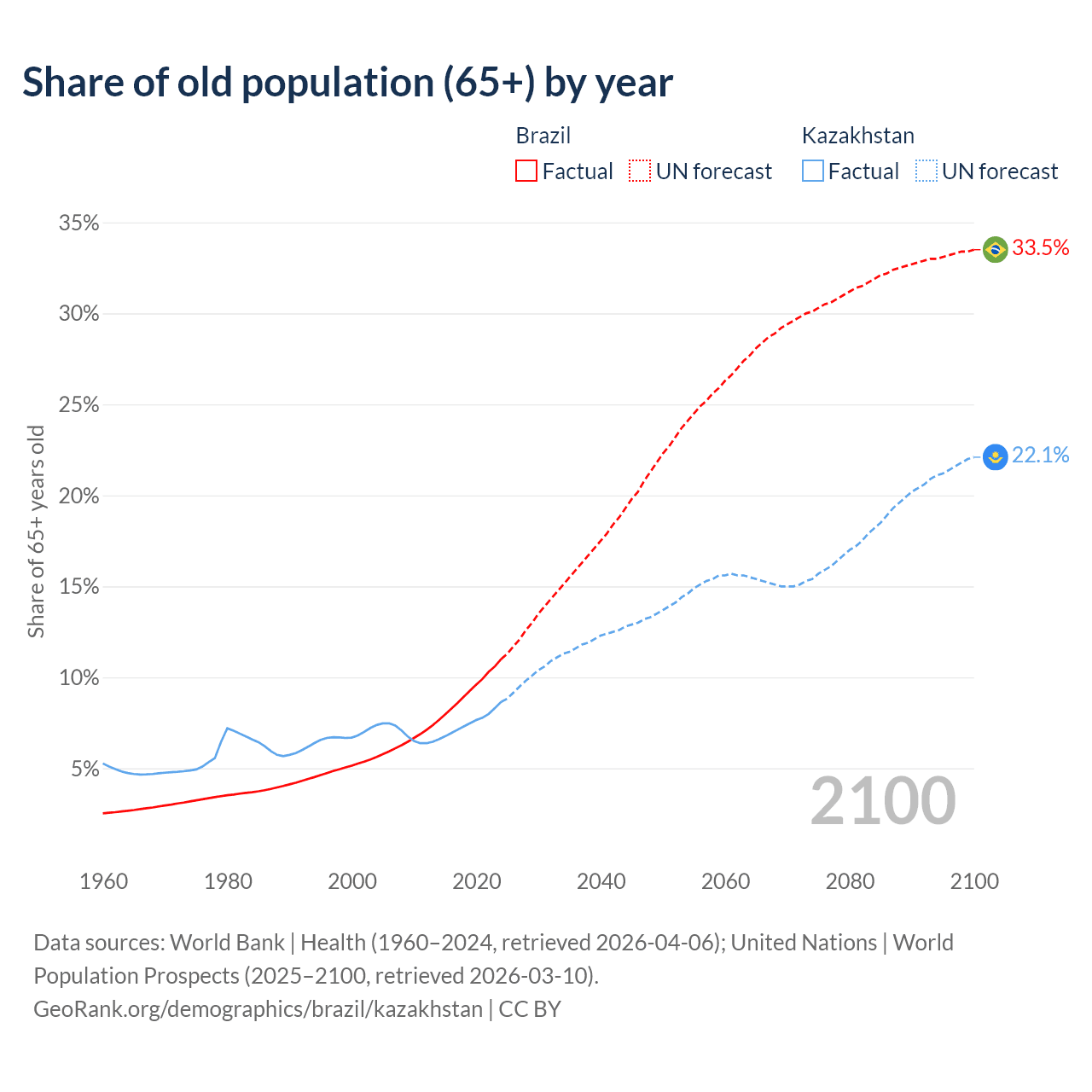 The share of older people aged 65 and over is 11% in Brazil and 8.65% in Kazakhstan. Life expectancy in Brazil compared to Kazakhstan .