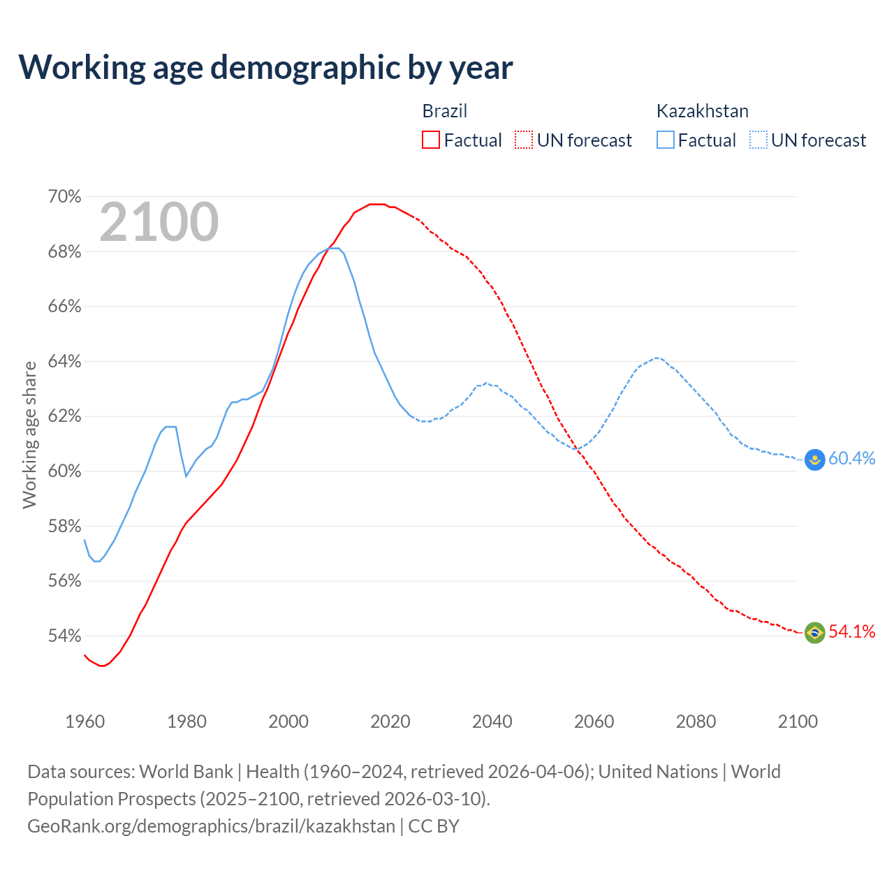 - Brazil has 148M working age adults (aged 15-64) vs 13.1M in Kazakhstan.