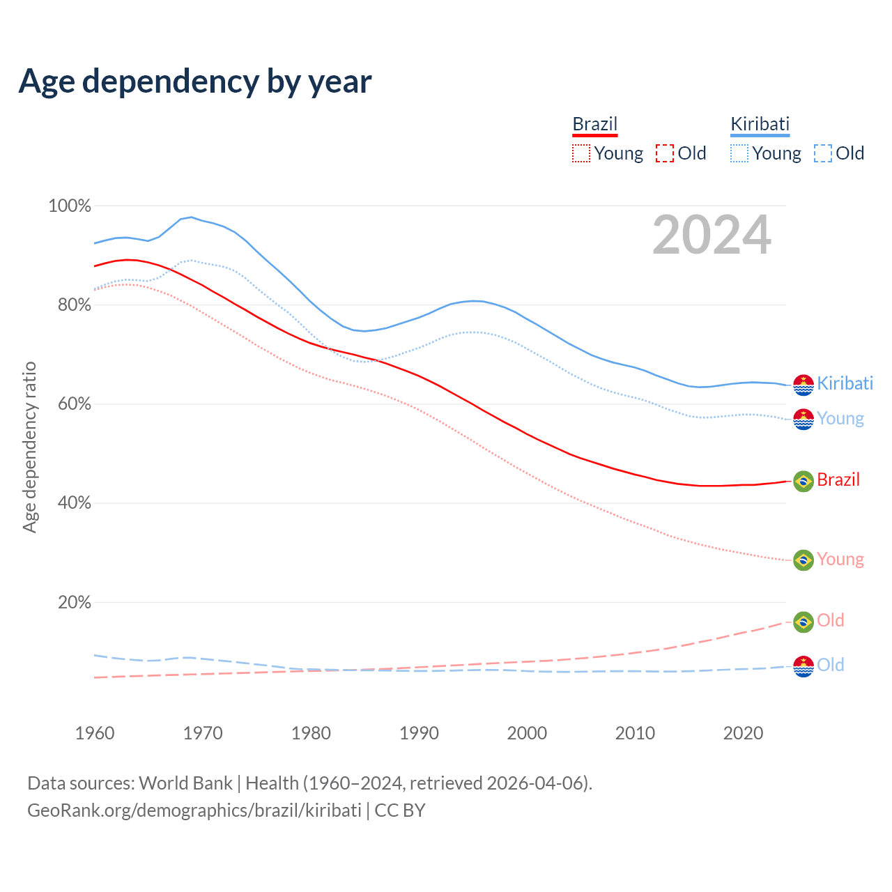 - The share of old-age demographic (65+) in Brazil is 11% vs 4.24% in Kiribati.